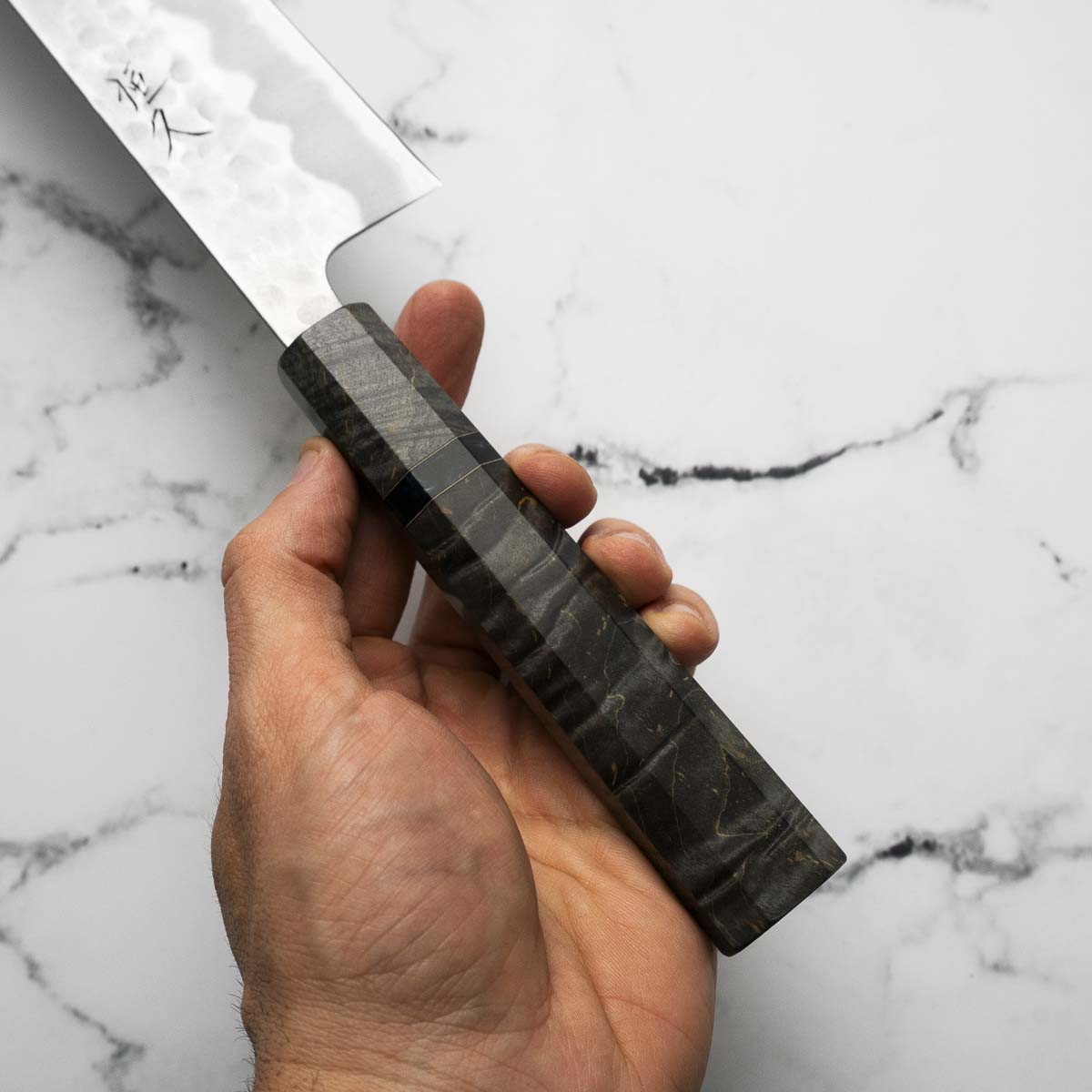Japanese White Steel #2, a traditional high-carbon steel, is cherished for its purity and fine grain structure, enabling razor-sharp edges, at the cost of being reactive. It is one of the easiest steels to sharpen, but cannot be left wet for even short periods otherwise rust spots can occur. If you’re fastidious in your knife maintenance, this knife steel can be extremely rewarding to use.