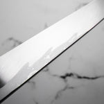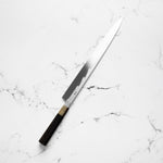 The Yanagiba knife, a staple in traditional Japanese cuisine, is a slender, long-bladed knife primarily used for slicing sashimi and sushi. Its graceful, single-beveled edge guarantees precise, thin cuts, preserving the texture and integrity of the fish. Revered for its sharpness and balance, the Yanagiba is essential for authentic Japanese food preparation.