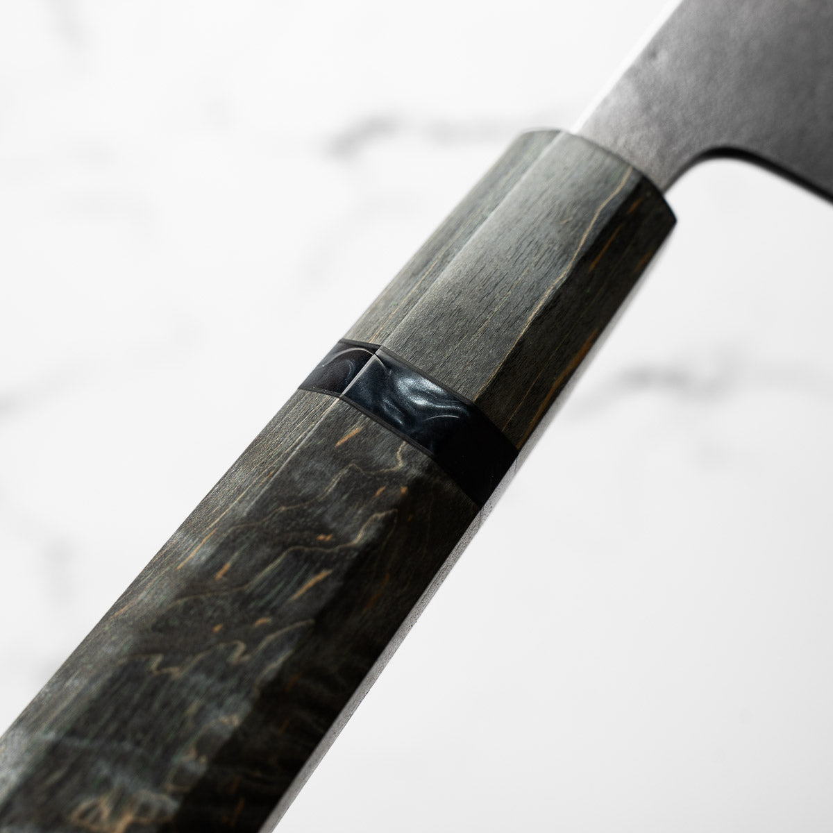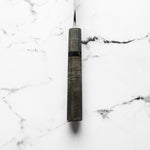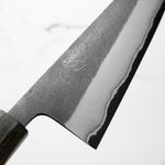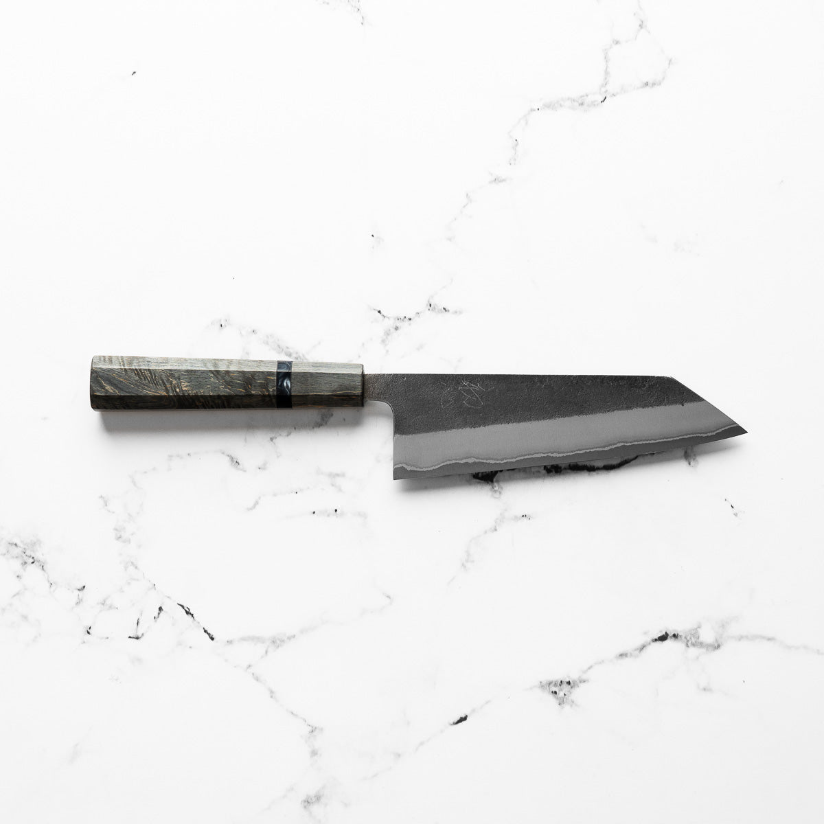 One of their most celebrated offerings is the SKD steel series — featuring a semi-stainless high-carbon core clad in stainless steel. The blades showcase a distinctive wide-bevel grind with a shallow hammer texture that sits stylistically between nashiji and kurouchi finishes. Paired with traditional burnt chestnut handles, each knife reflects Yoshikane’s dedication to consistency, craftsmanship, and timeless design.