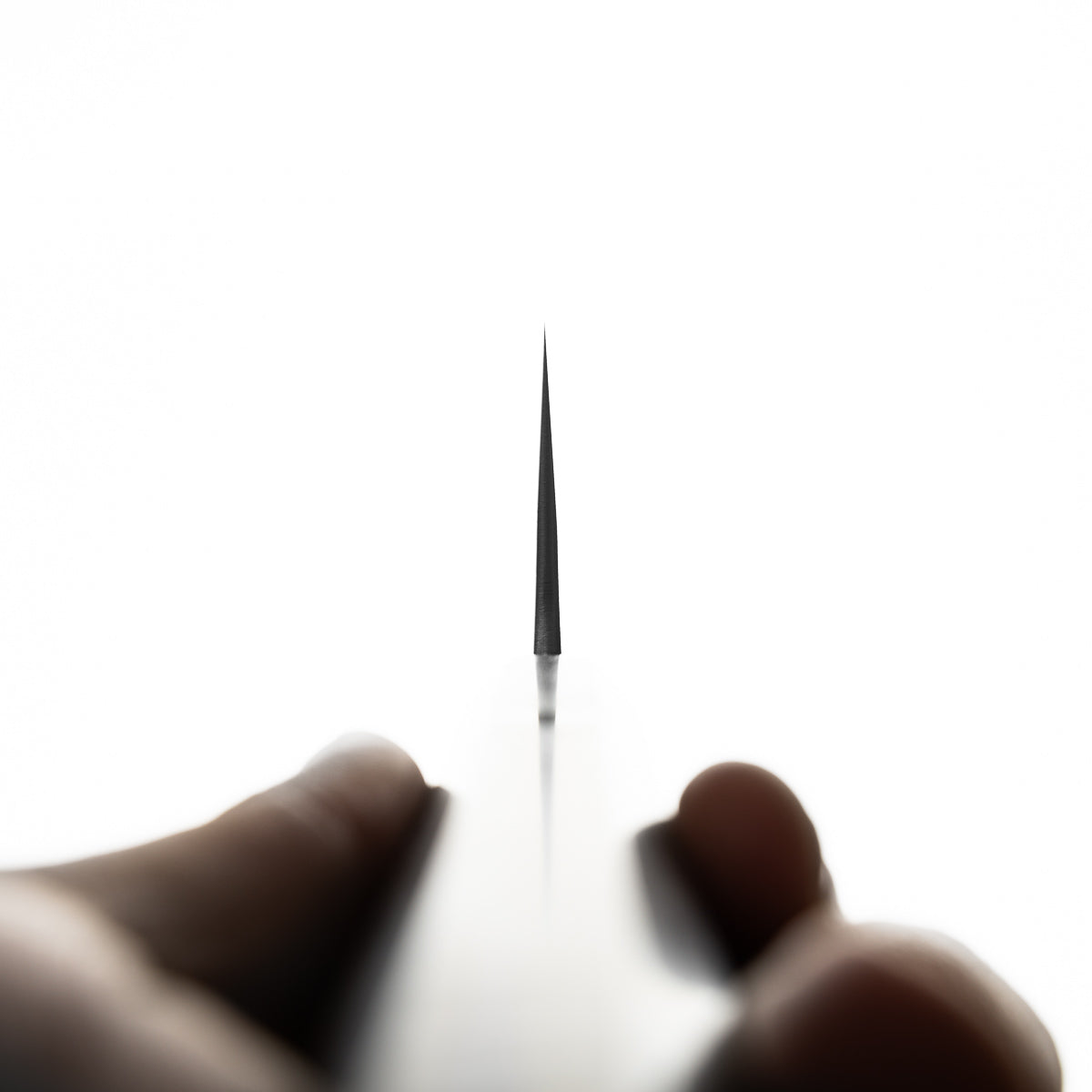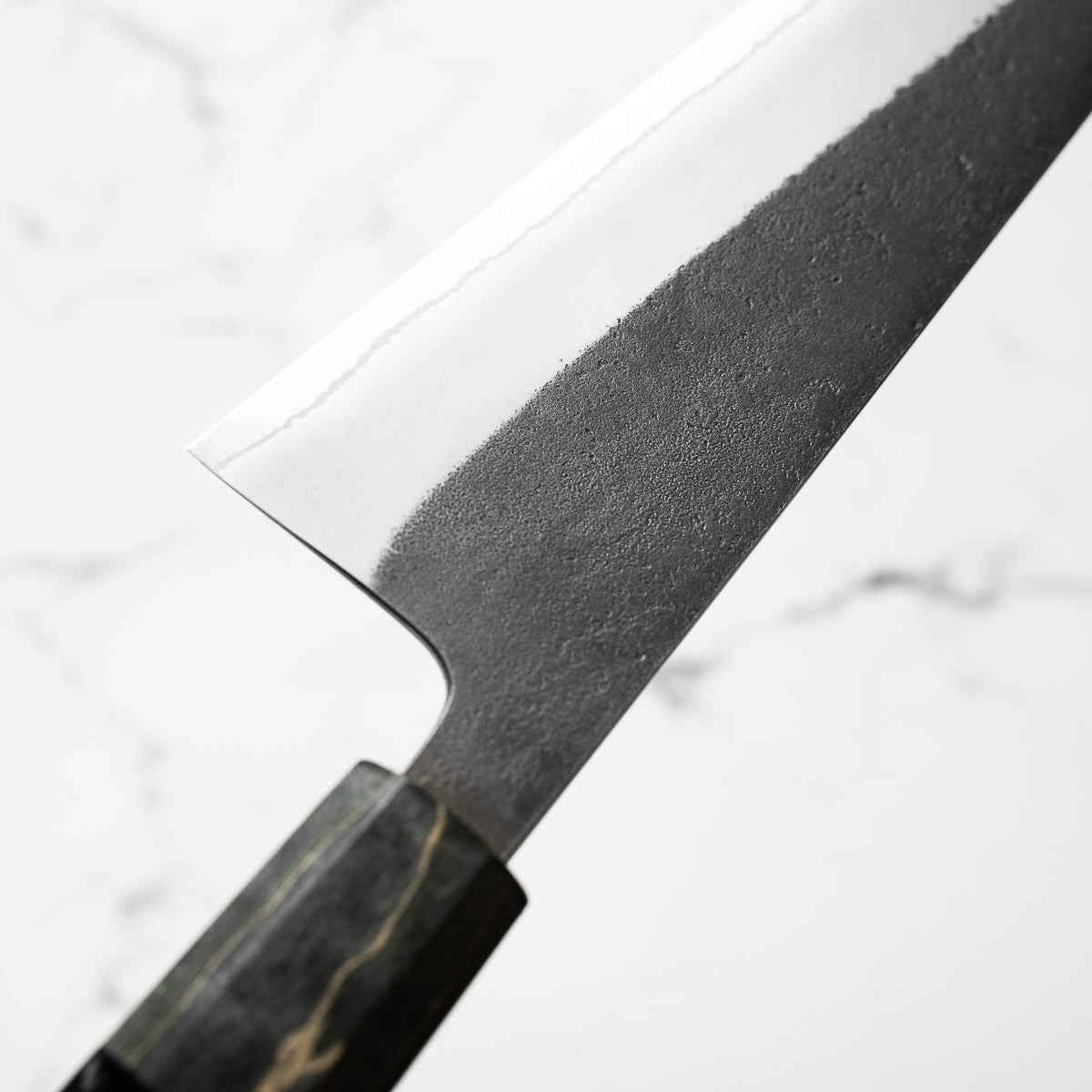 Japanese White Steel #2, a traditional high-carbon steel, is cherished for its purity and fine grain structure, enabling razor-sharp edges, at the cost of being reactive. It is one of the easiest steels to sharpen, but cannot be left wet for even short periods otherwise rust spots can occur. If you’re fastidious in your knife maintenance, this knife steel can be extremely rewarding to use.