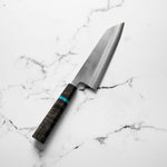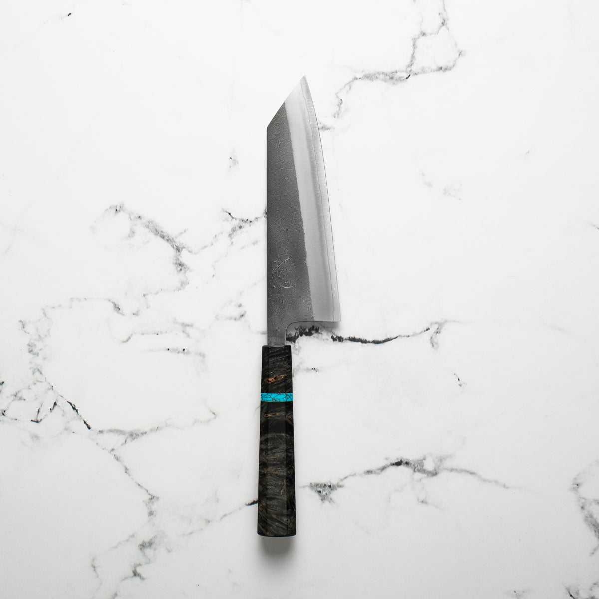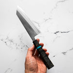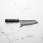 One of their most celebrated offerings is the SKD steel series — featuring a semi-stainless high-carbon core clad in stainless steel. The blades showcase a distinctive wide-bevel grind with a shallow hammer texture that sits stylistically between nashiji and kurouchi finishes. Paired with traditional burnt chestnut handles, each knife reflects Yoshikane’s dedication to consistency, craftsmanship, and timeless design.