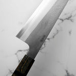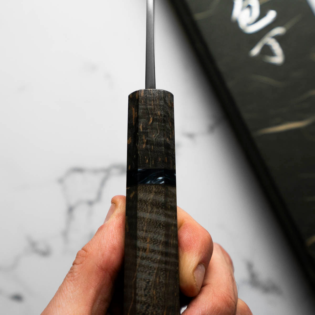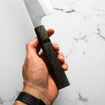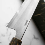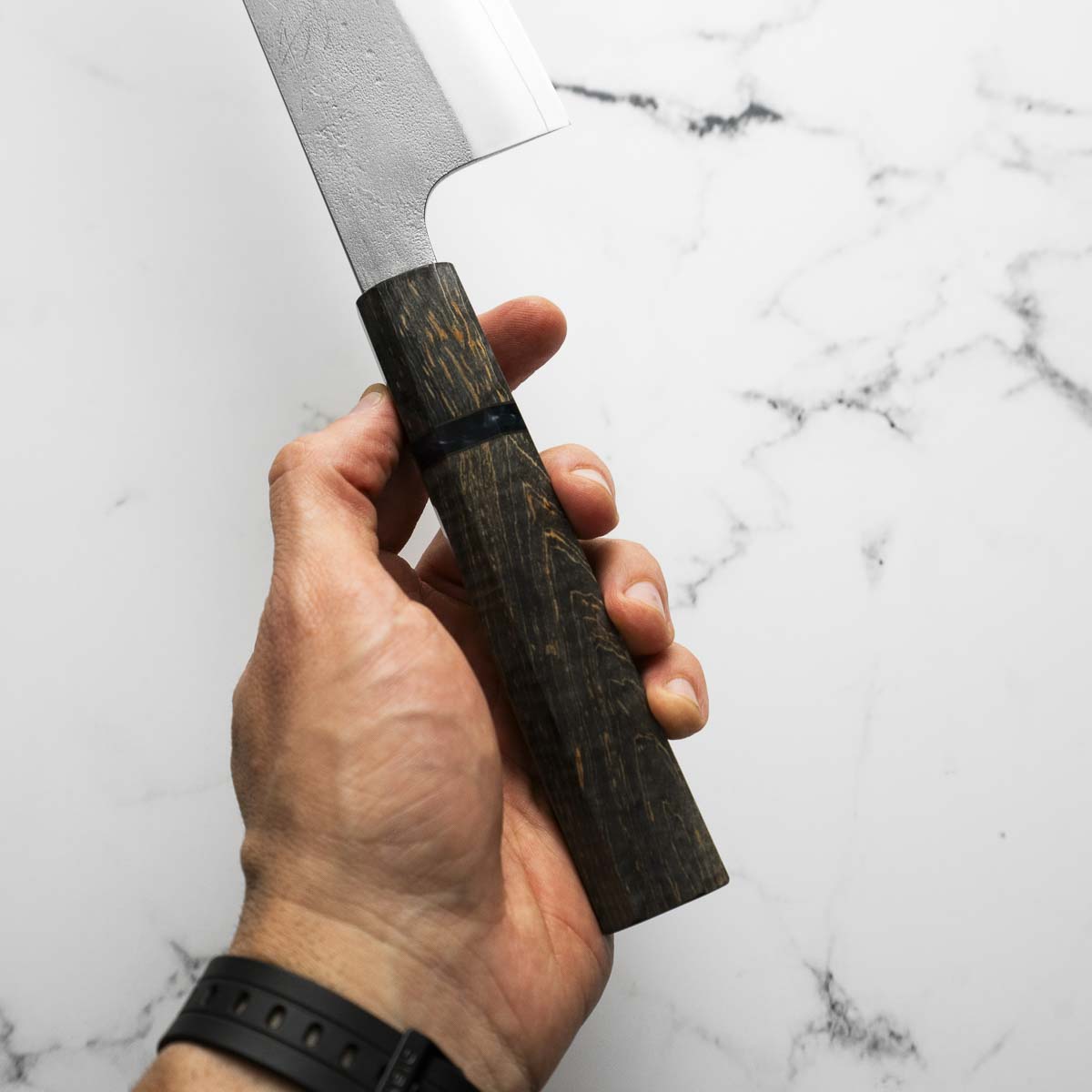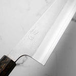 One of their most celebrated offerings is the SKD steel series — featuring a semi-stainless high-carbon core clad in stainless steel. The blades showcase a distinctive wide-bevel grind with a shallow hammer texture that sits stylistically between nashiji and kurouchi finishes. Paired with traditional burnt chestnut handles, each knife reflects Yoshikane’s dedication to consistency, craftsmanship, and timeless design.