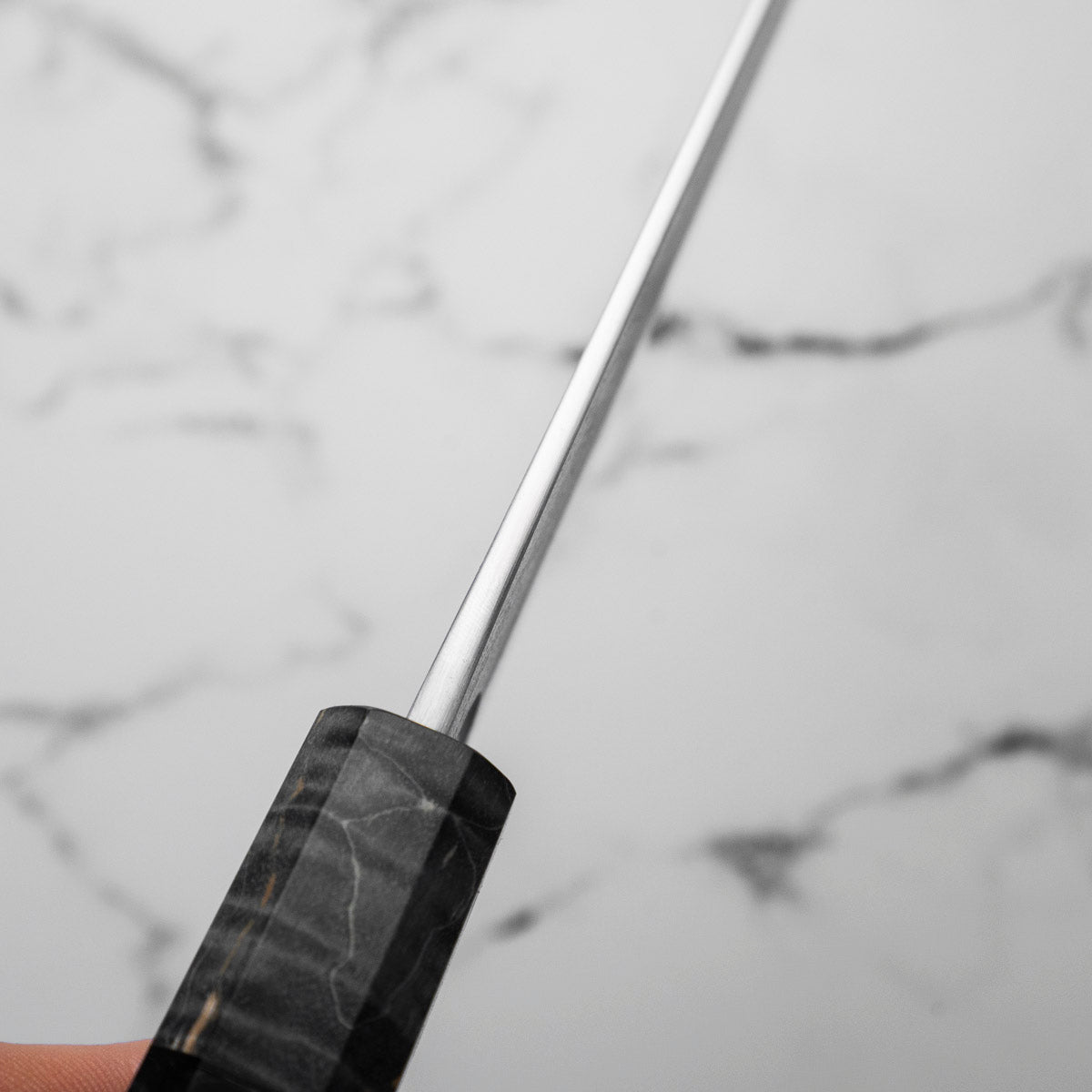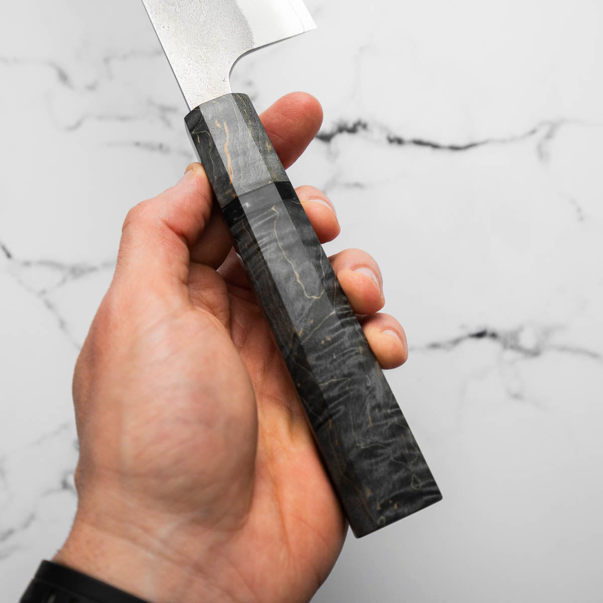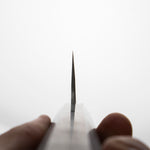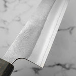 One of their most celebrated offerings is the SKD steel series — featuring a semi-stainless high-carbon core clad in stainless steel. The blades showcase a distinctive wide-bevel grind with a shallow hammer texture that sits stylistically between nashiji and kurouchi finishes. Paired with traditional burnt chestnut handles, each knife reflects Yoshikane’s dedication to consistency, craftsmanship, and timeless design.