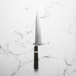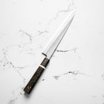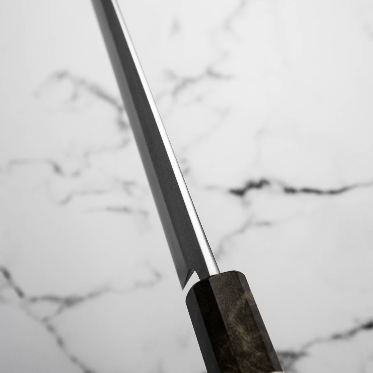The Sujihiki knife, a traditional Japanese slicer, is designed for carving and fileting. With its long, narrow blade, typically ranging from 240mm to 330mm, it excels in creating clean, smooth cuts through meat and fish. Its length ensures long, uninterrupted strokes, making it perfect for precise slicing tasks.
