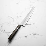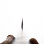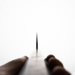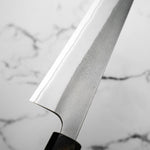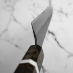One of their most celebrated offerings is the SKD steel series — featuring a semi-stainless high-carbon core clad in stainless steel. The blades showcase a distinctive wide-bevel grind with a shallow hammer texture that sits stylistically between nashiji and kurouchi finishes. Paired with traditional burnt chestnut handles, each knife reflects Yoshikane’s dedication to consistency, craftsmanship, and timeless design.