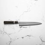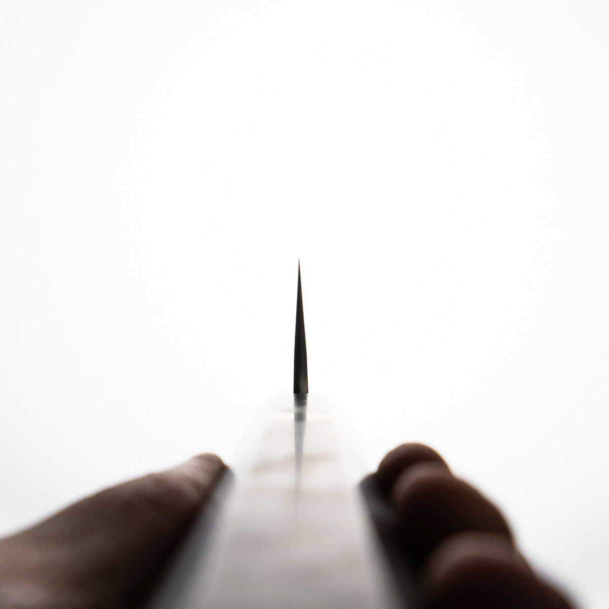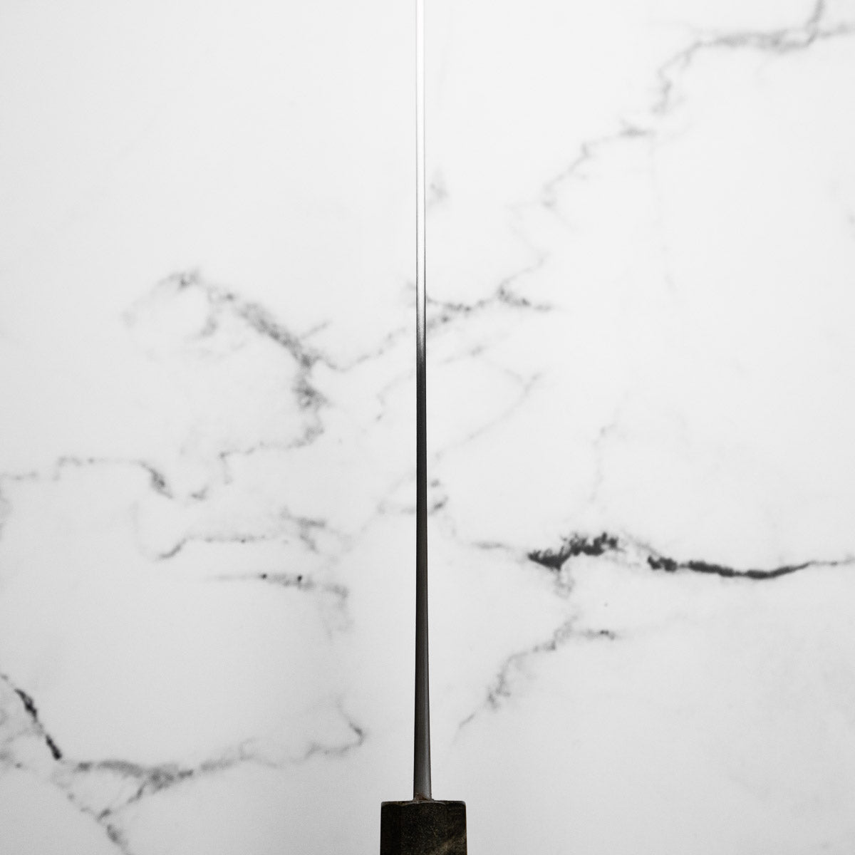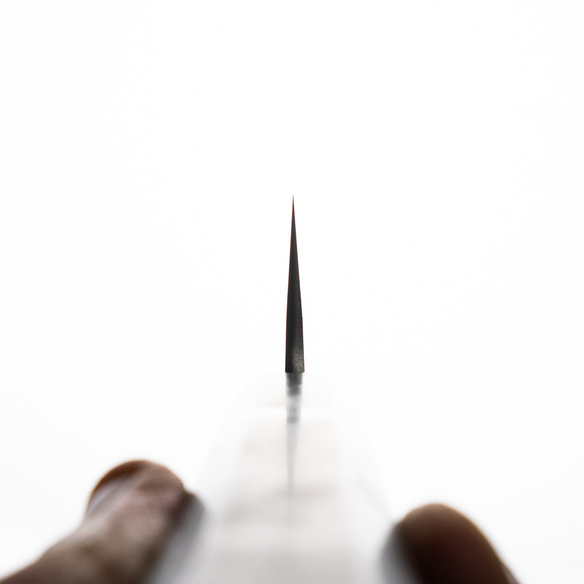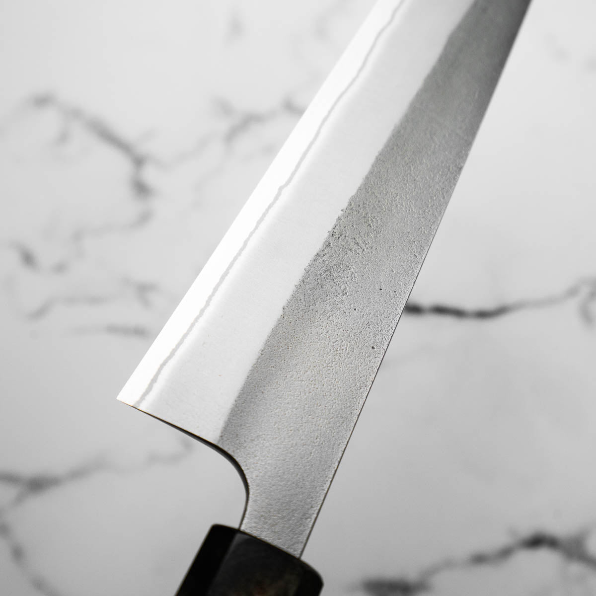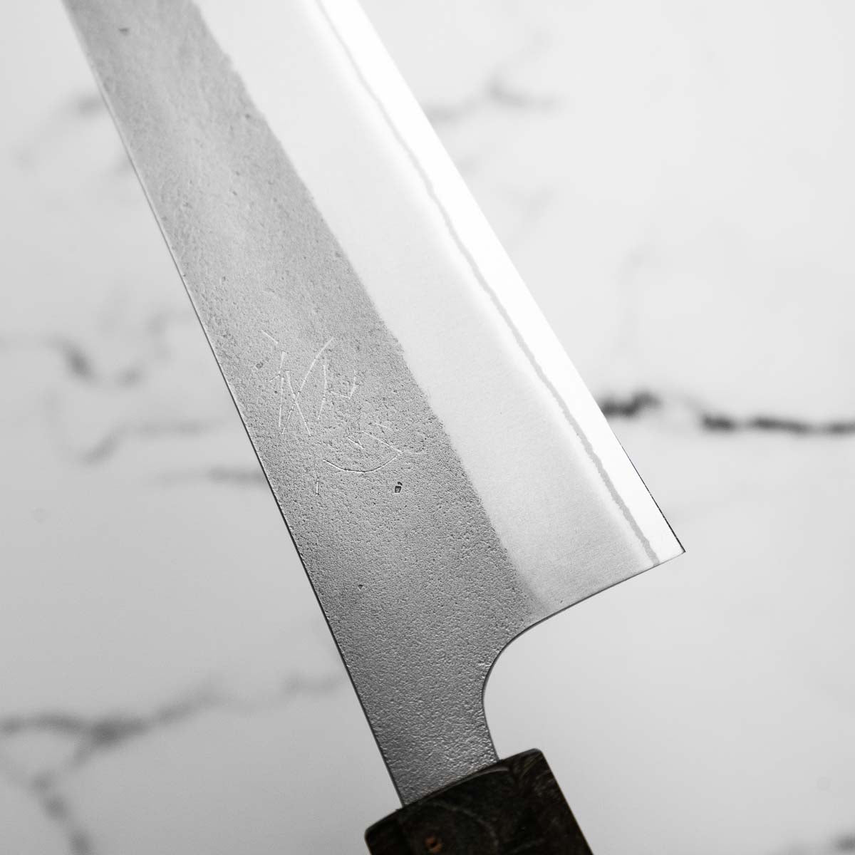 Japanese White Steel #2, a traditional high-carbon steel, is cherished for its purity and fine grain structure, enabling razor-sharp edges, at the cost of being reactive. It is one of the easiest steels to sharpen, but cannot be left wet for even short periods otherwise rust spots can occur. If you’re fastidious in your knife maintenance, this knife steel can be extremely rewarding to use.