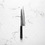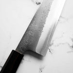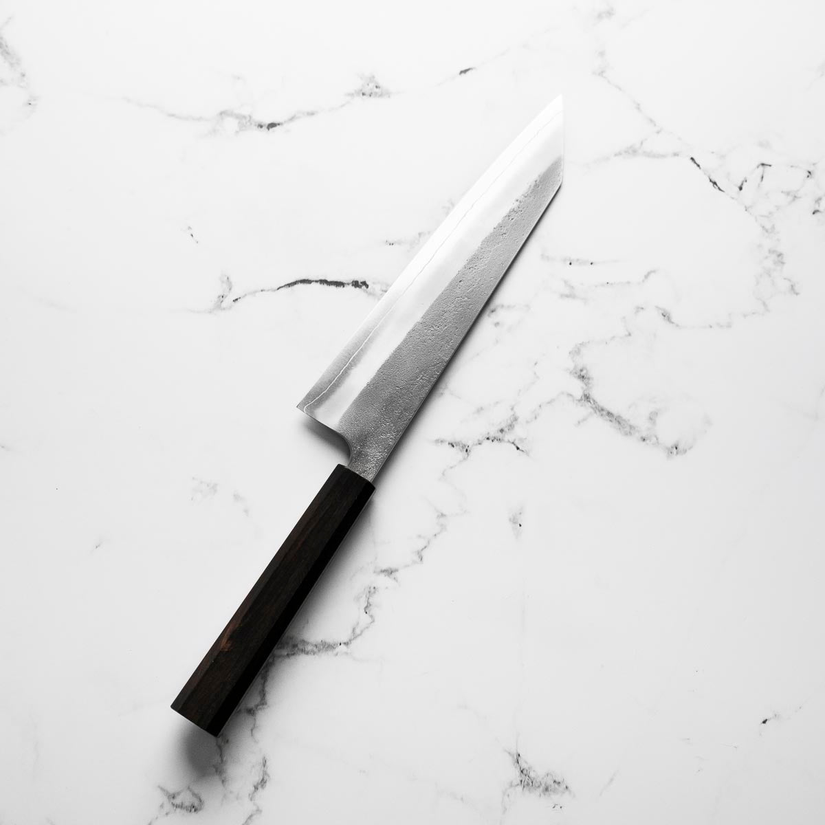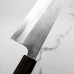 One of their most celebrated offerings is the SKD steel series — featuring a semi-stainless high-carbon core clad in stainless steel. The blades showcase a distinctive wide-bevel grind with a shallow hammer texture that sits stylistically between nashiji and kurouchi finishes. Paired with traditional burnt chestnut handles, each knife reflects Yoshikane’s dedication to consistency, craftsmanship, and timeless design.