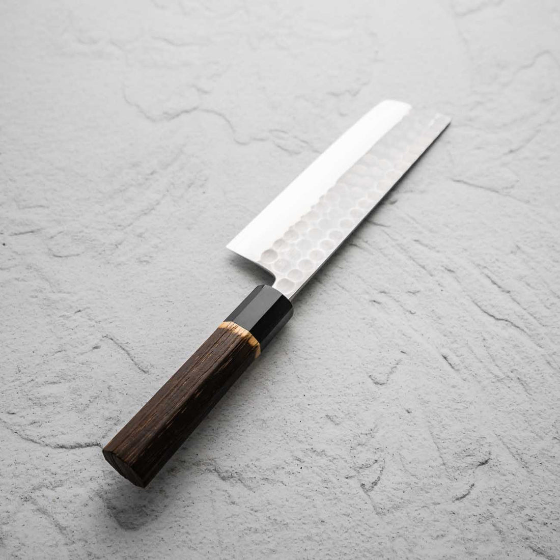 One of their most celebrated offerings is the SKD steel series — featuring a semi-stainless high-carbon core clad in stainless steel. The blades showcase a distinctive wide-bevel grind with a shallow hammer texture that sits stylistically between nashiji and kurouchi finishes. Paired with traditional burnt chestnut handles, each knife reflects Yoshikane’s dedication to consistency, craftsmanship, and timeless design.