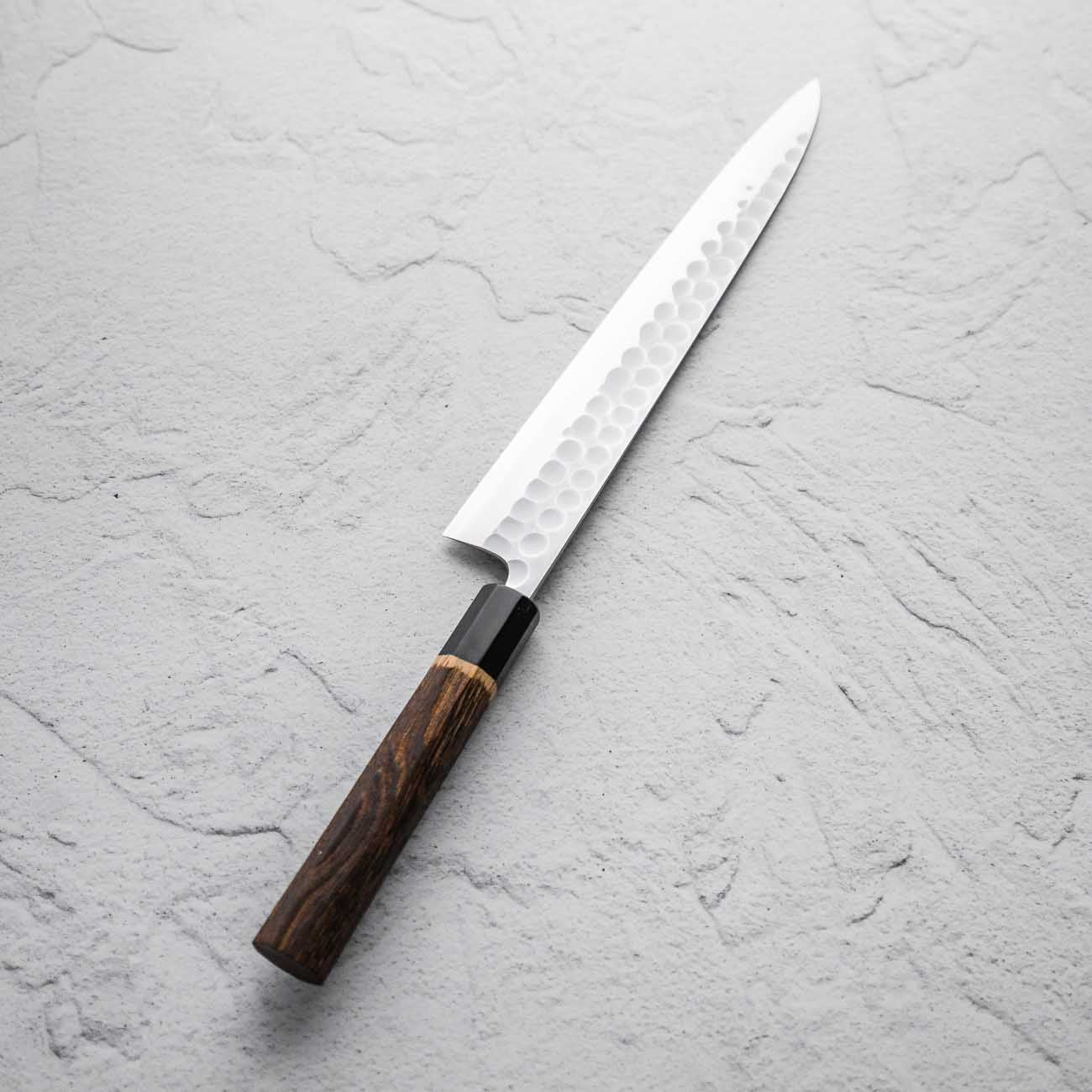 The Sujihiki knife, a traditional Japanese slicer, is designed for carving and fileting. With its long, narrow blade, typically ranging from 240mm to 330mm, it excels in creating clean, smooth cuts through meat and fish. Its length ensures long, uninterrupted strokes, making it perfect for precise slicing tasks.