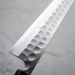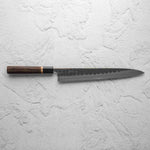 One of their most celebrated offerings is the SKD steel series — featuring a semi-stainless high-carbon core clad in stainless steel. The blades showcase a distinctive wide-bevel grind with a shallow hammer texture that sits stylistically between nashiji and kurouchi finishes. Paired with traditional burnt chestnut handles, each knife reflects Yoshikane’s dedication to consistency, craftsmanship, and timeless design.