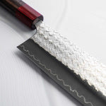 Japanese SG2, also known as R2 steel, is a high-end, powdered metallurgy stainless steel and one of the finest knife-making steels available in Japan. It is a favourite of many for its exceptional hardness and edge retention. It's fine, uniform grain structure enables razor-sharp edges, all the while holding an edge for much longer than Carbon steel knives, without needing to be concerned about rust appearing.