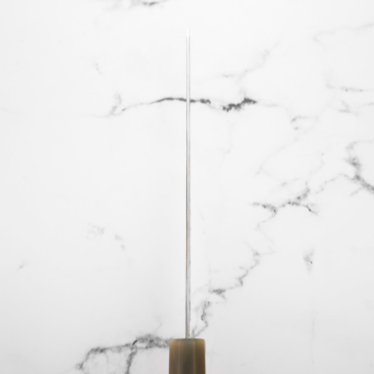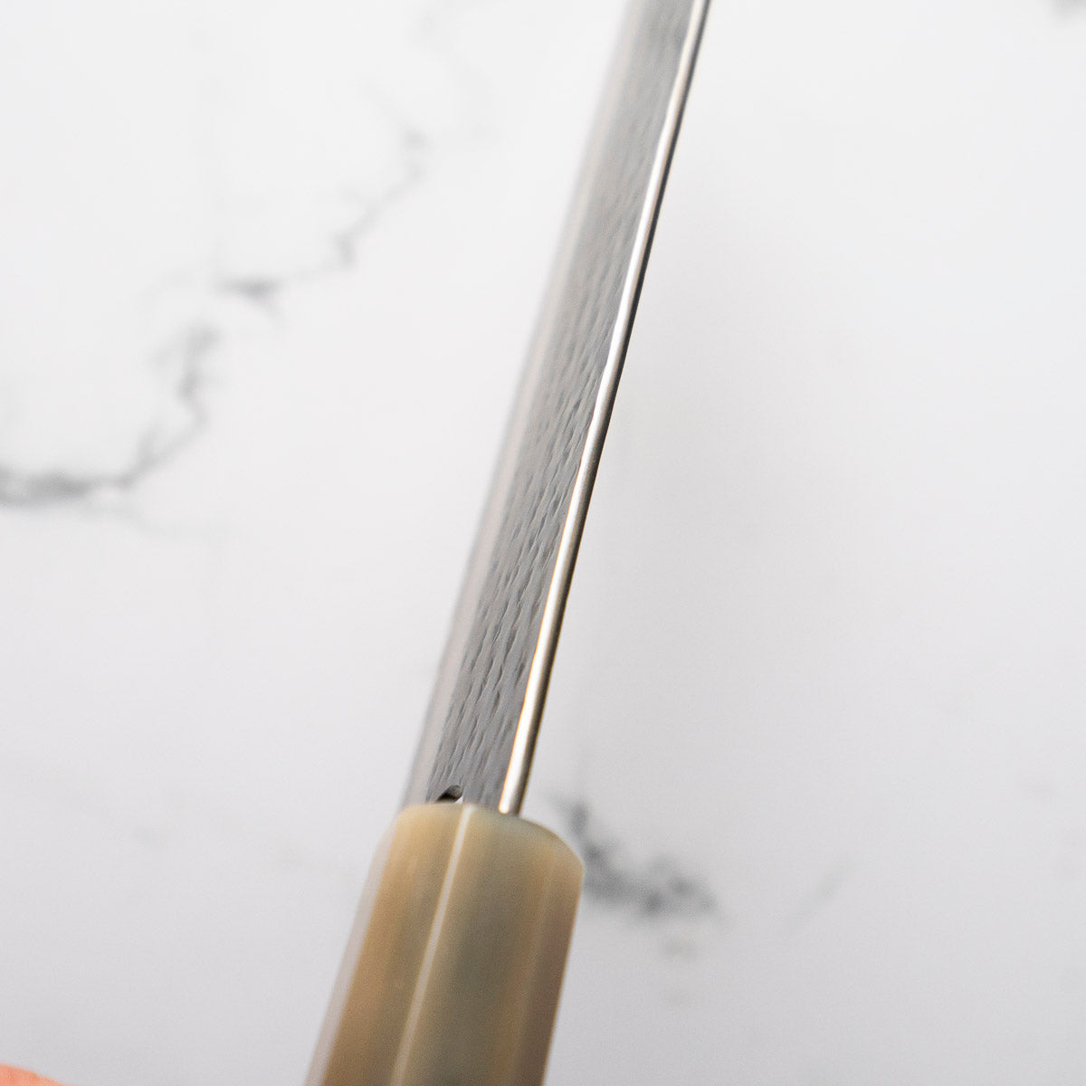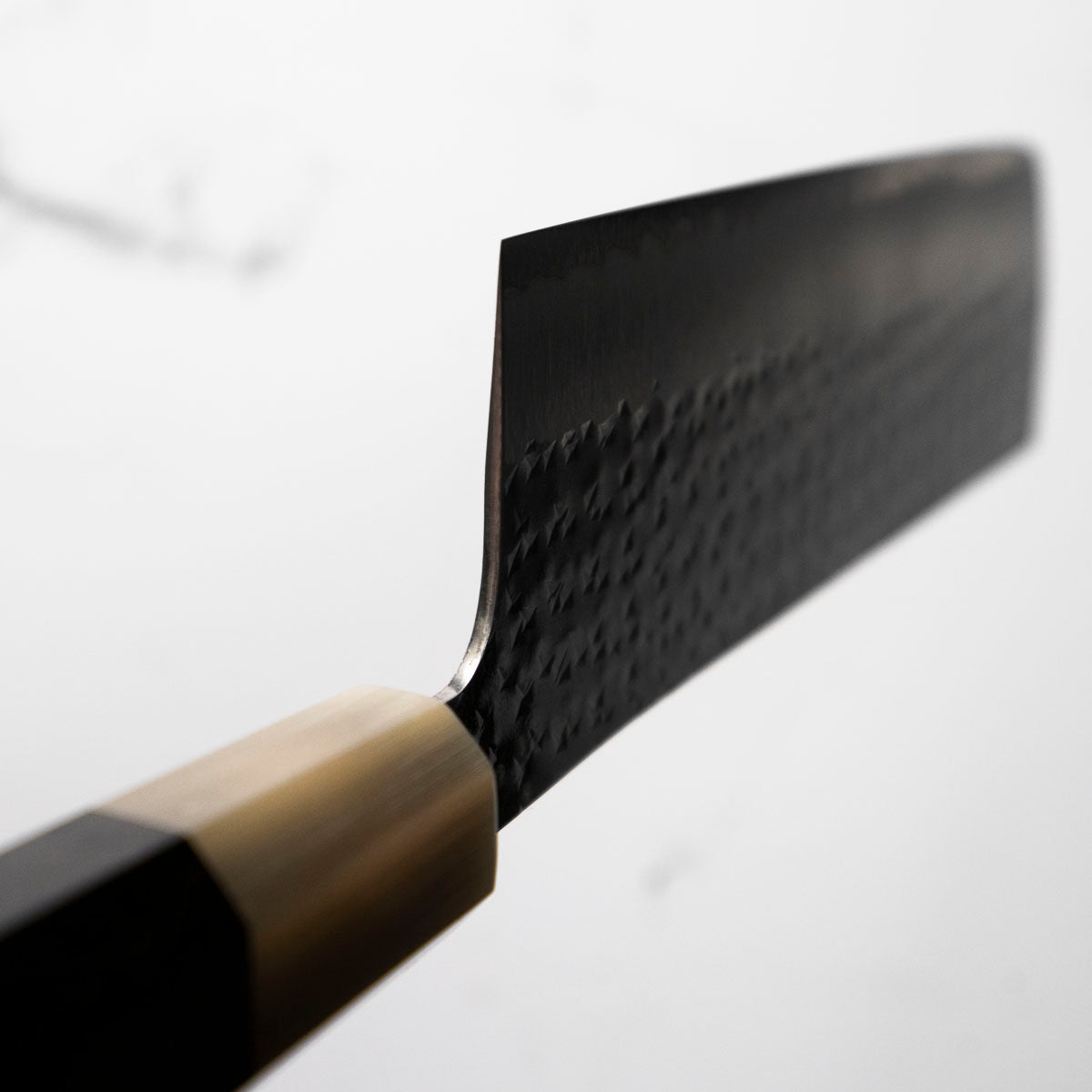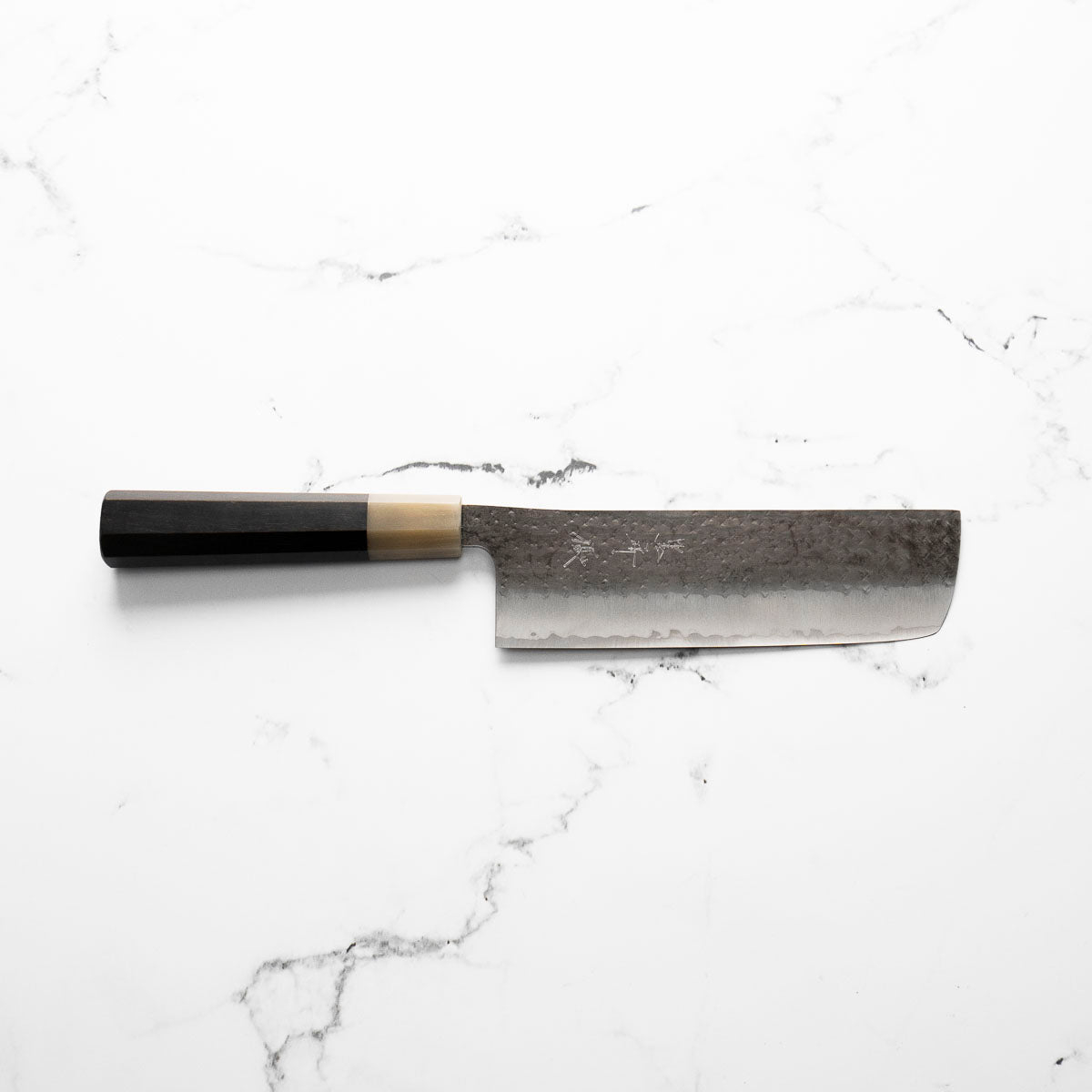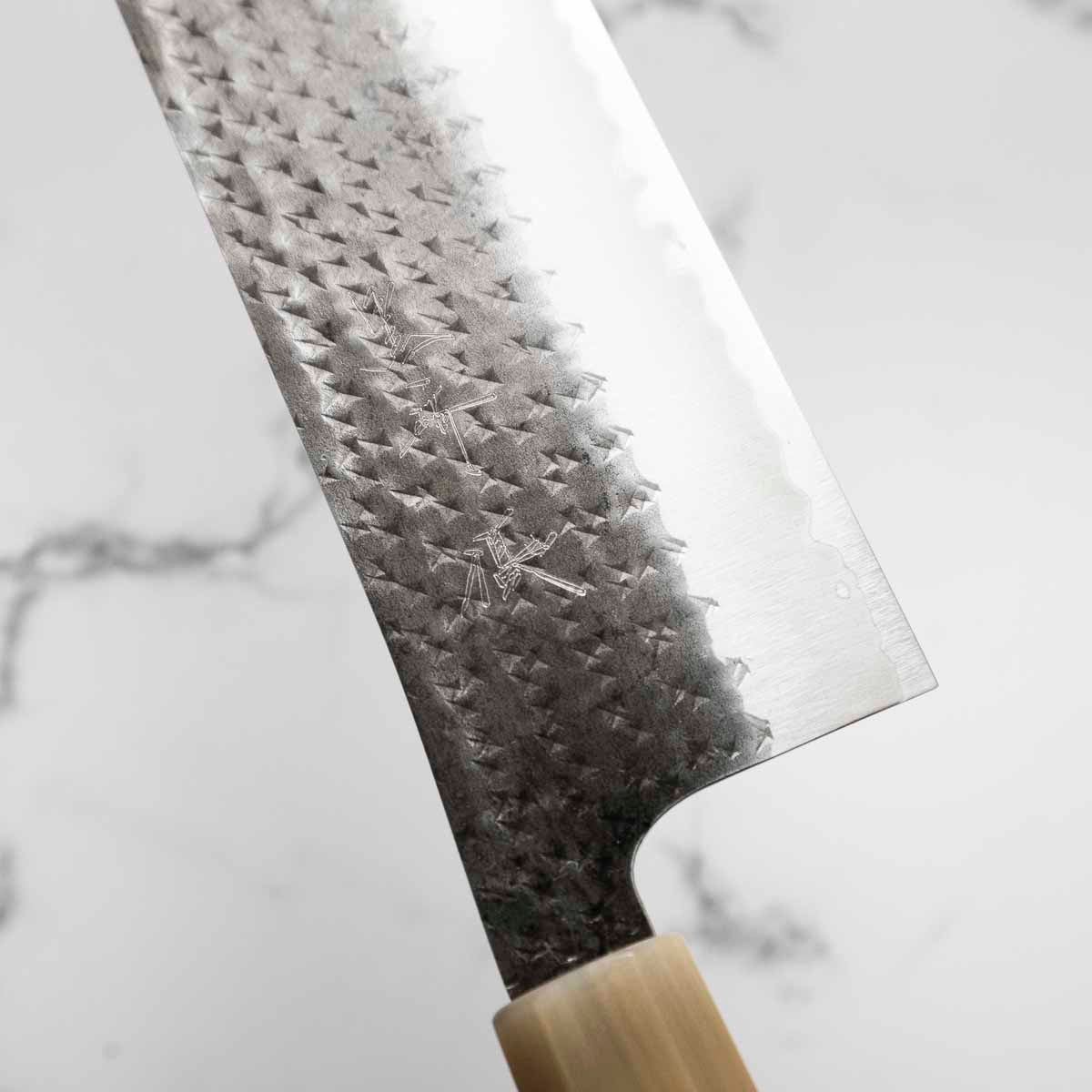 His knives are instantly recognizable for their striking Tsuchime and Suminagashi finishes, thin grinds, and use of high-performance steels such as SG2, HAP40, and stainless-clad Blue Super. Kurosaki’s Fujin series, with its dramatic wind-patterned hammer finish, helped cement his reputation as a blacksmith who blends artistry and technical brilliance in equal measure.