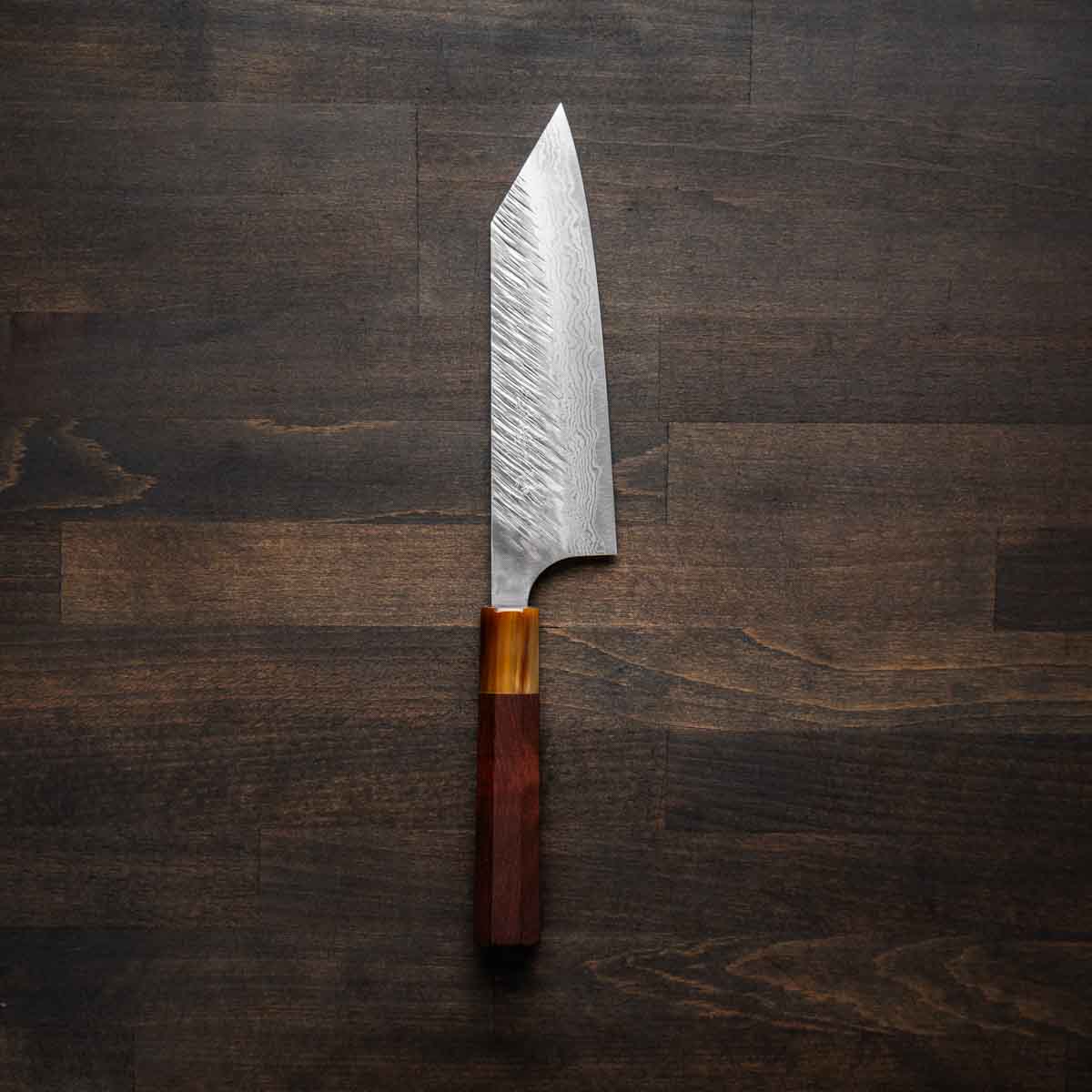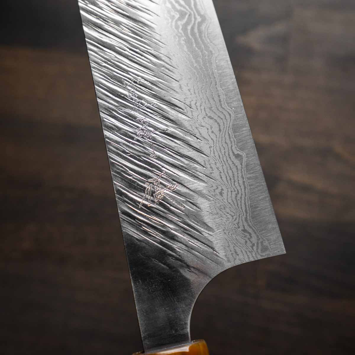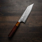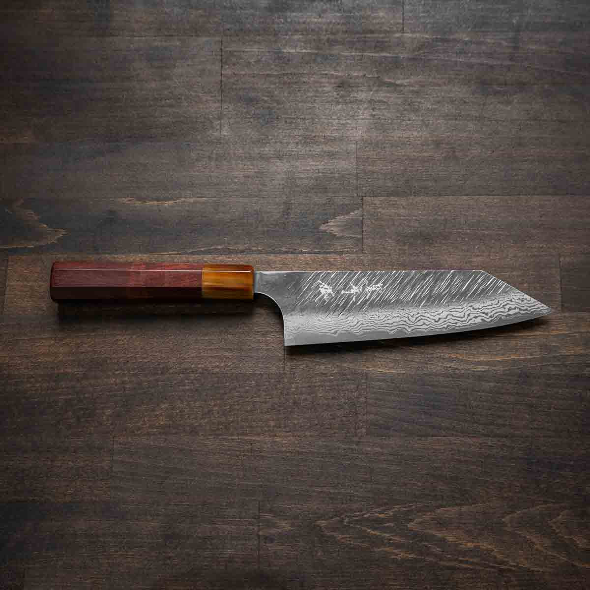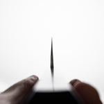 His knives are instantly recognizable for their striking Tsuchime and Suminagashi finishes, thin grinds, and use of high-performance steels such as SG2, HAP40, and stainless-clad Blue Super. Kurosaki’s Fujin series, with its dramatic wind-patterned hammer finish, helped cement his reputation as a blacksmith who blends artistry and technical brilliance in equal measure.
