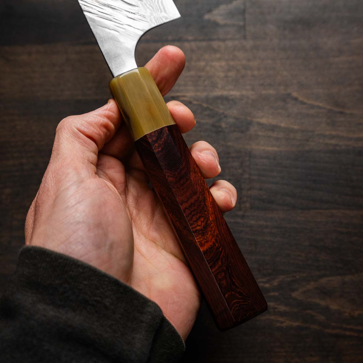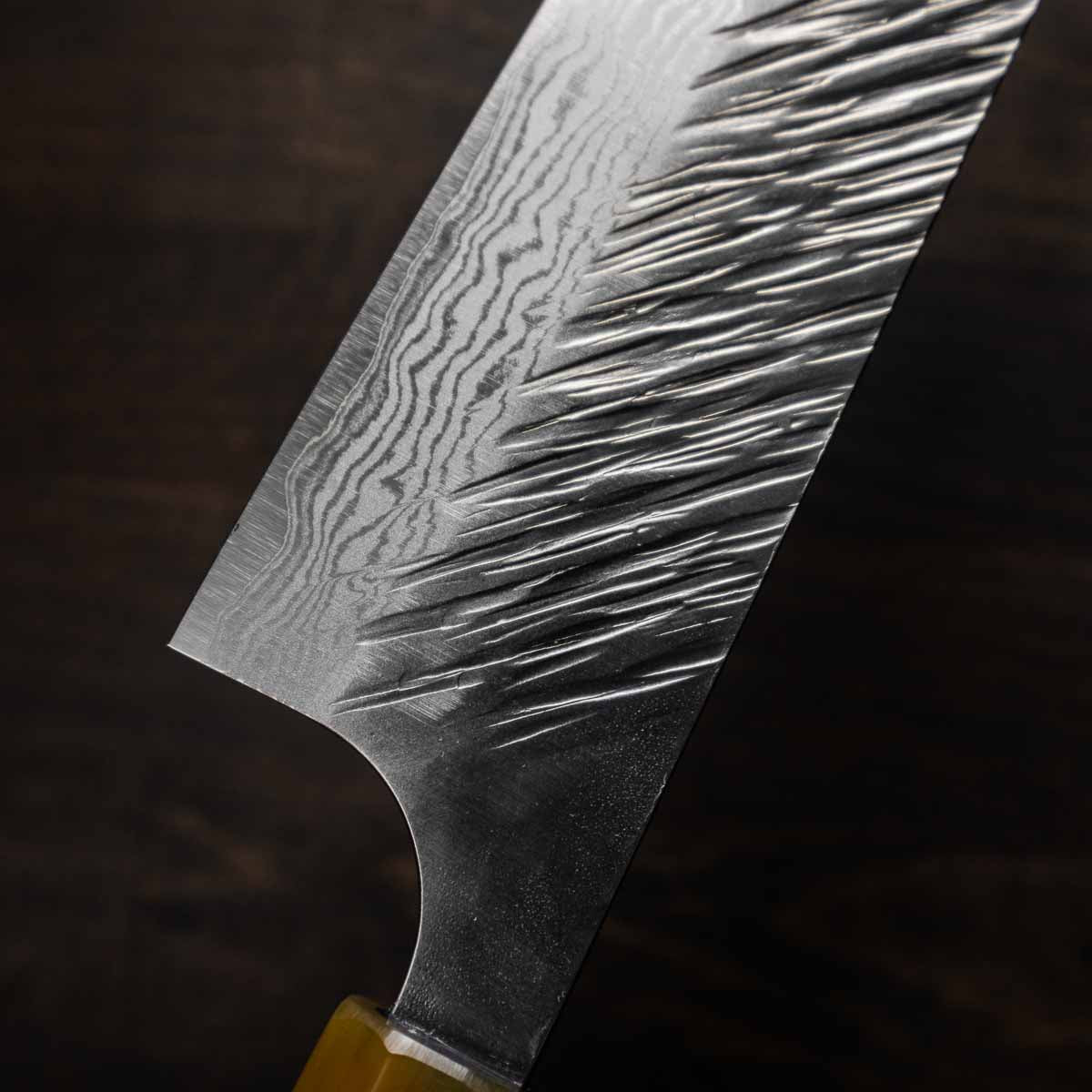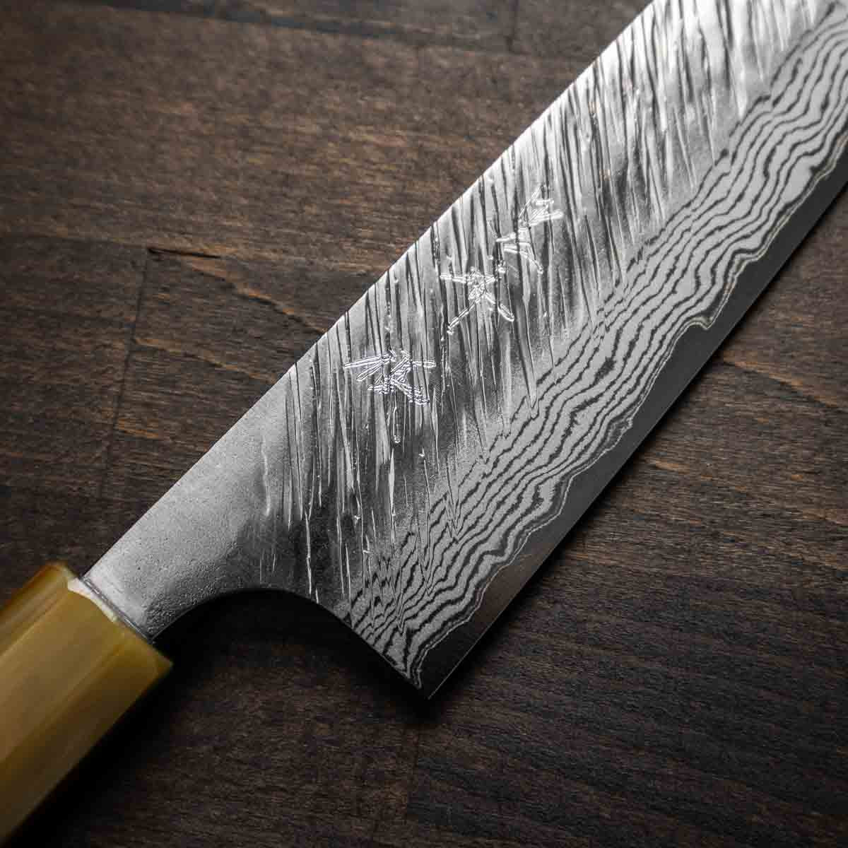 His knives are instantly recognizable for their striking Tsuchime and Suminagashi finishes, thin grinds, and use of high-performance steels such as SG2, HAP40, and stainless-clad Blue Super. Kurosaki’s Fujin series, with its dramatic wind-patterned hammer finish, helped cement his reputation as a blacksmith who blends artistry and technical brilliance in equal measure.