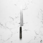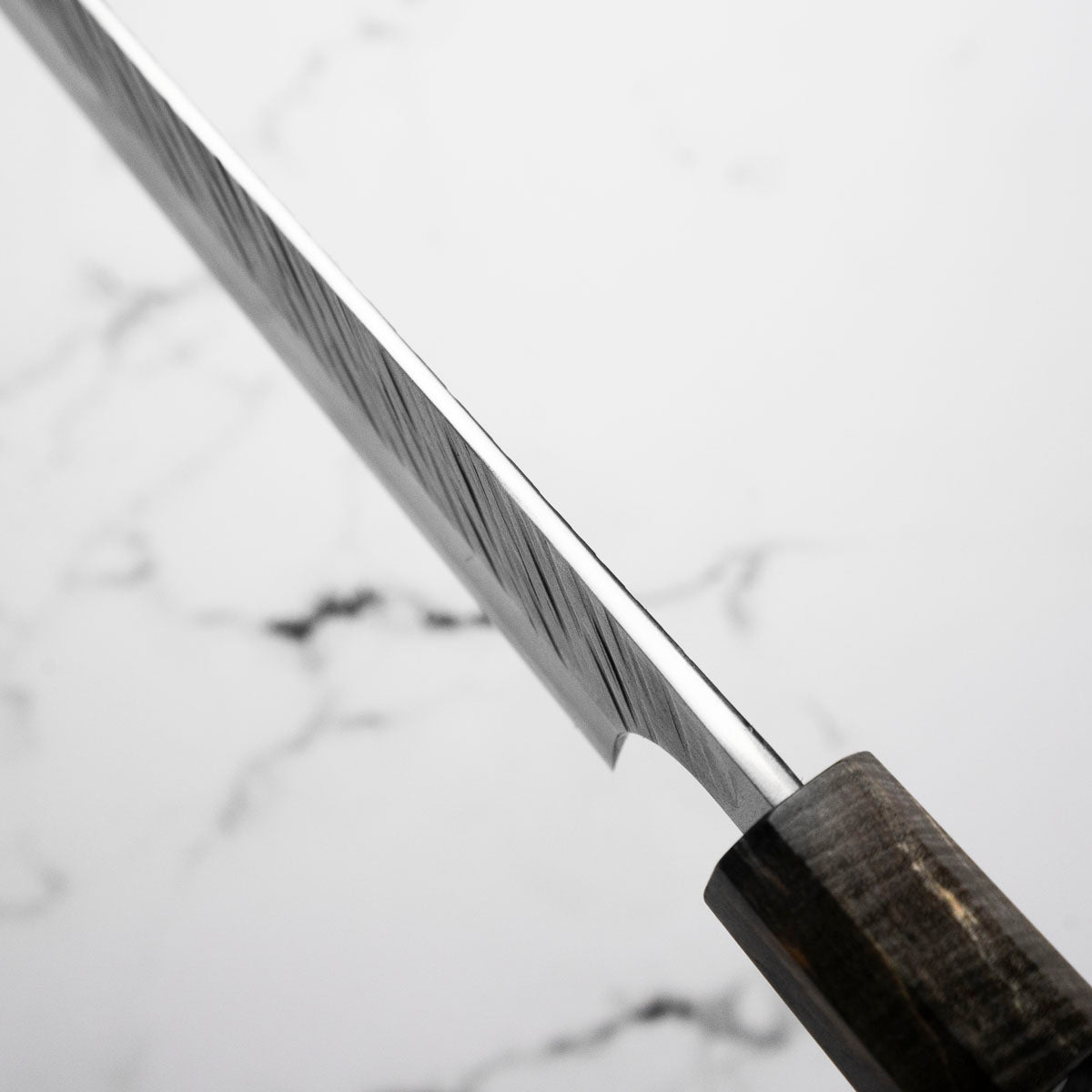 The Sujihiki knife, a traditional Japanese slicer, is designed for carving and fileting. With its long, narrow blade, typically ranging from 240mm to 330mm, it excels in creating clean, smooth cuts through meat and fish. Its length ensures long, uninterrupted strokes, making it perfect for precise slicing tasks.