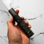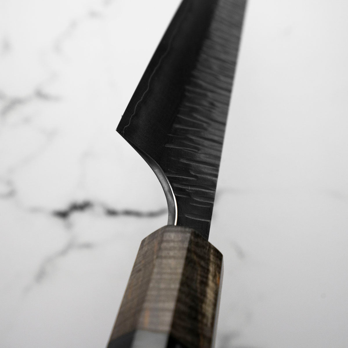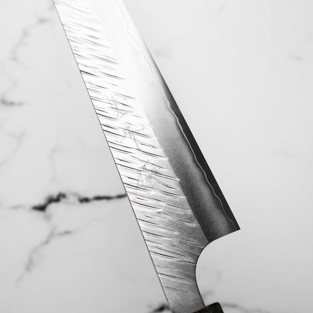 His knives are instantly recognizable for their striking Tsuchime and Suminagashi finishes, thin grinds, and use of high-performance steels such as SG2, HAP40, and stainless-clad Blue Super. Kurosaki’s Fujin series, with its dramatic wind-patterned hammer finish, helped cement his reputation as a blacksmith who blends artistry and technical brilliance in equal measure.