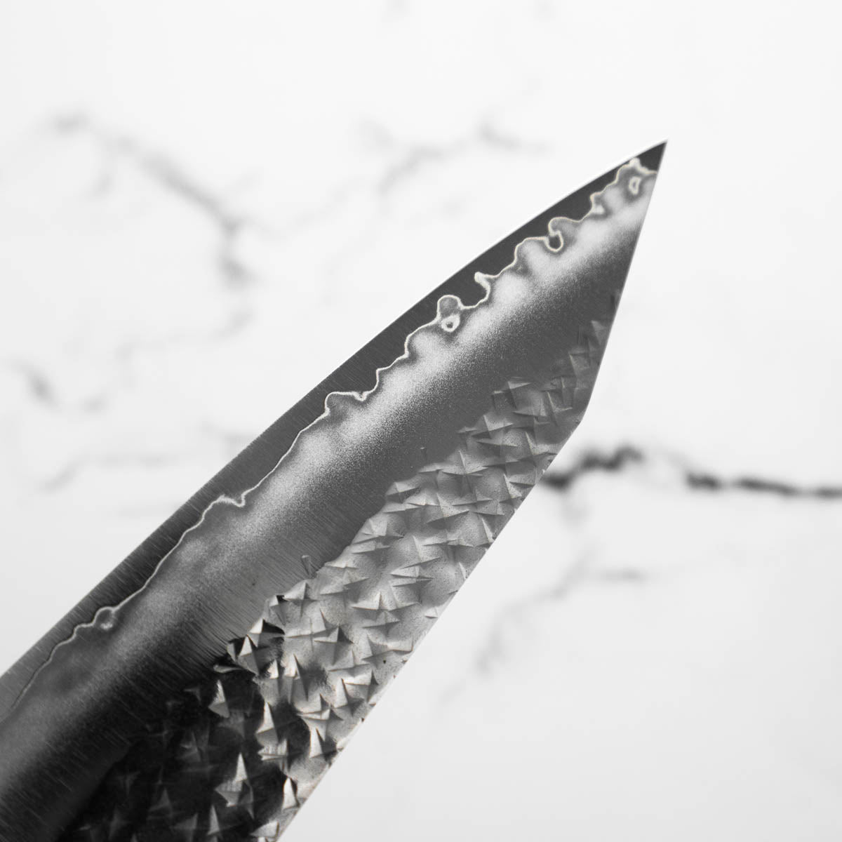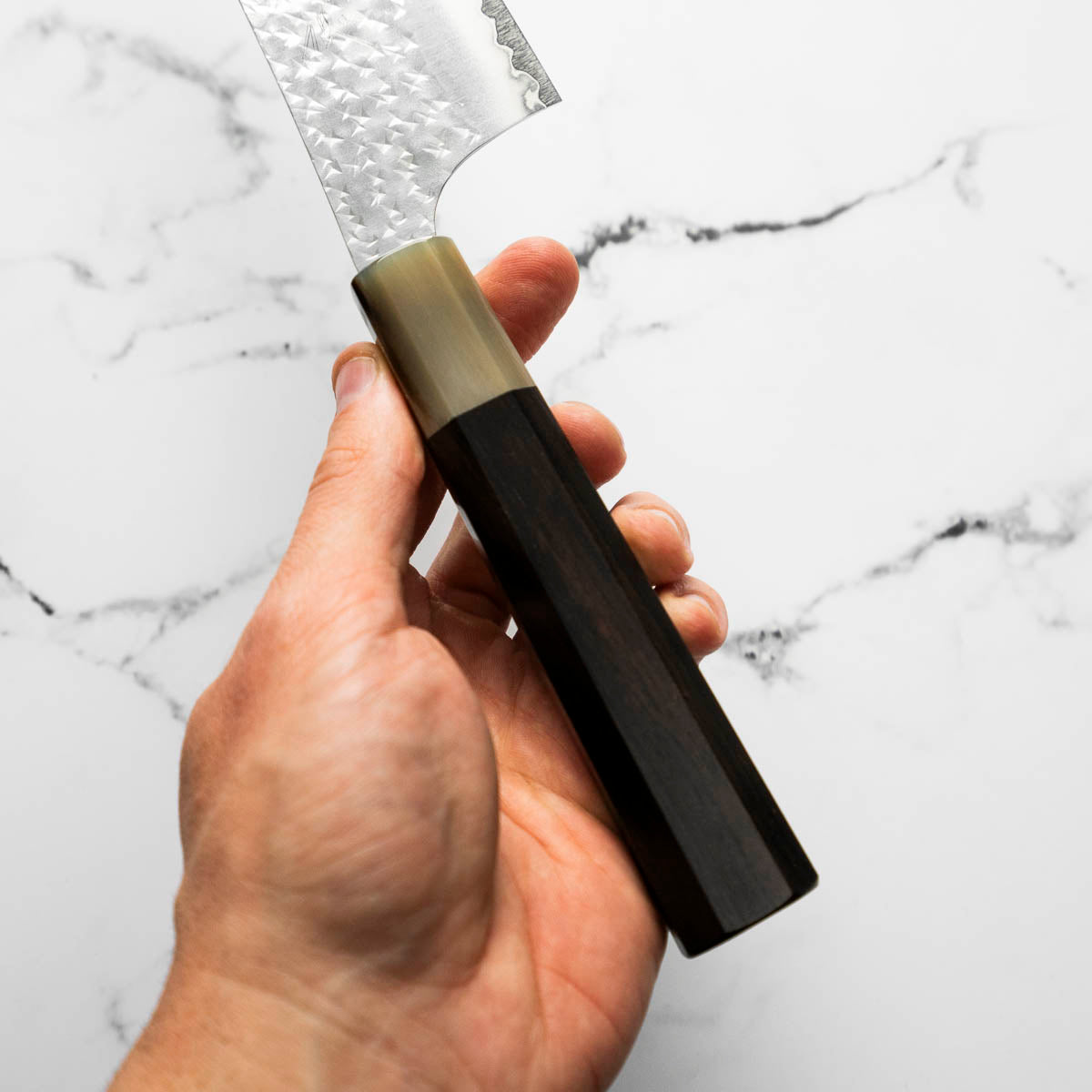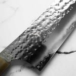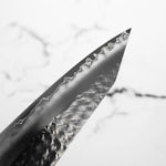 His knives are instantly recognizable for their striking Tsuchime and Suminagashi finishes, thin grinds, and use of high-performance steels such as SG2, HAP40, and stainless-clad Blue Super. Kurosaki’s Fujin series, with its dramatic wind-patterned hammer finish, helped cement his reputation as a blacksmith who blends artistry and technical brilliance in equal measure.