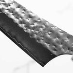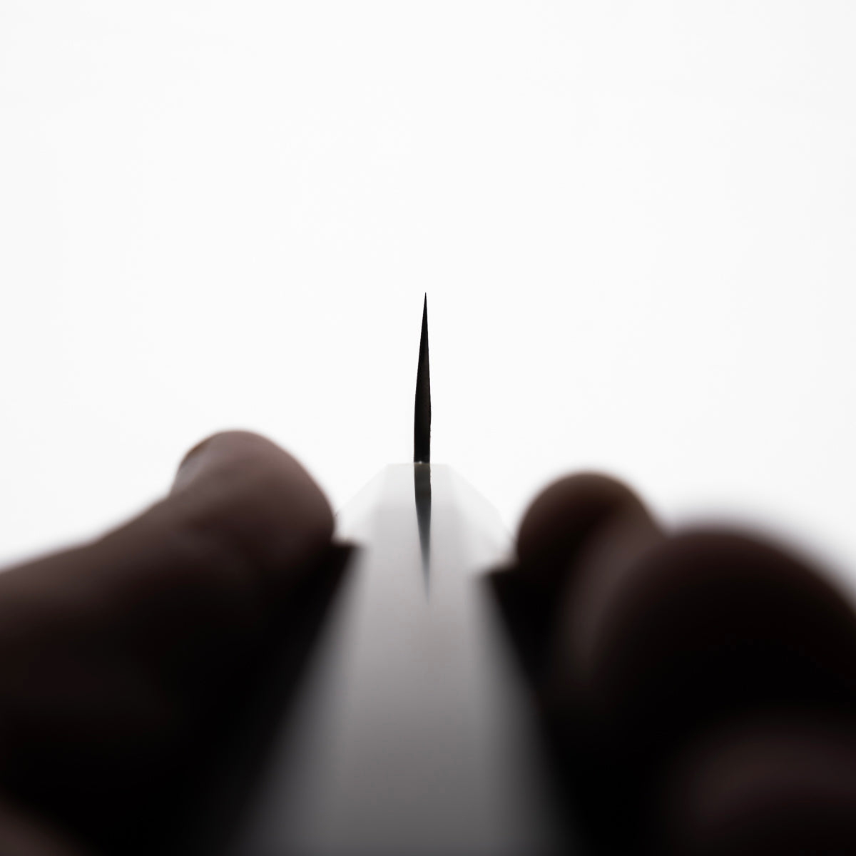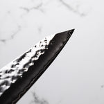 His knives are instantly recognizable for their striking Tsuchime and Suminagashi finishes, thin grinds, and use of high-performance steels such as SG2, HAP40, and stainless-clad Blue Super. Kurosaki’s Fujin series, with its dramatic wind-patterned hammer finish, helped cement his reputation as a blacksmith who blends artistry and technical brilliance in equal measure.