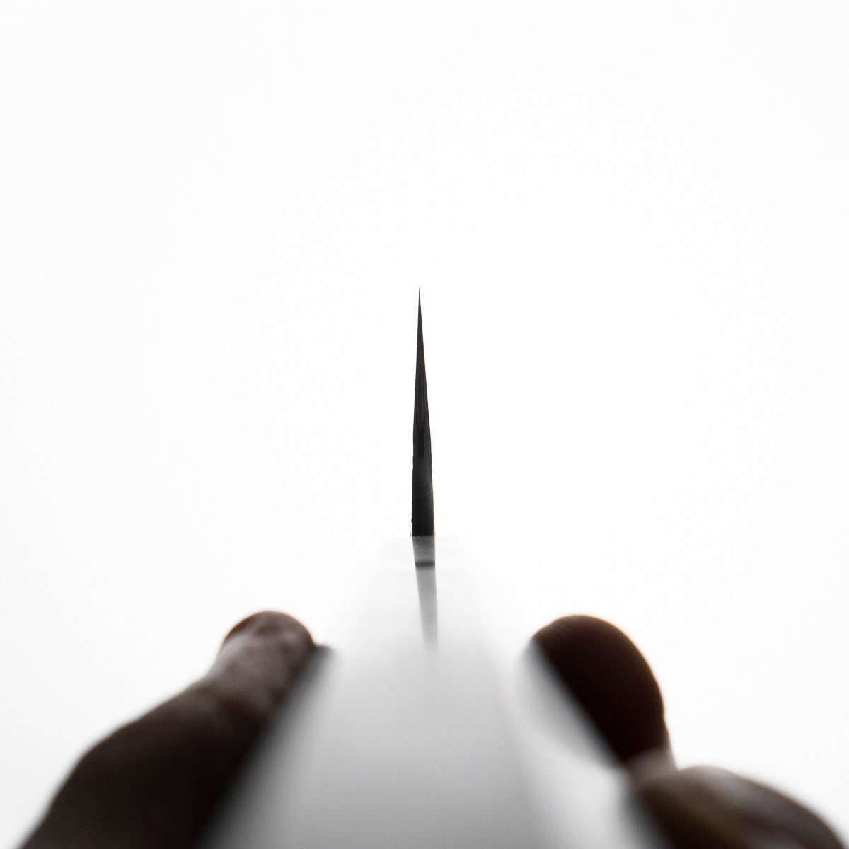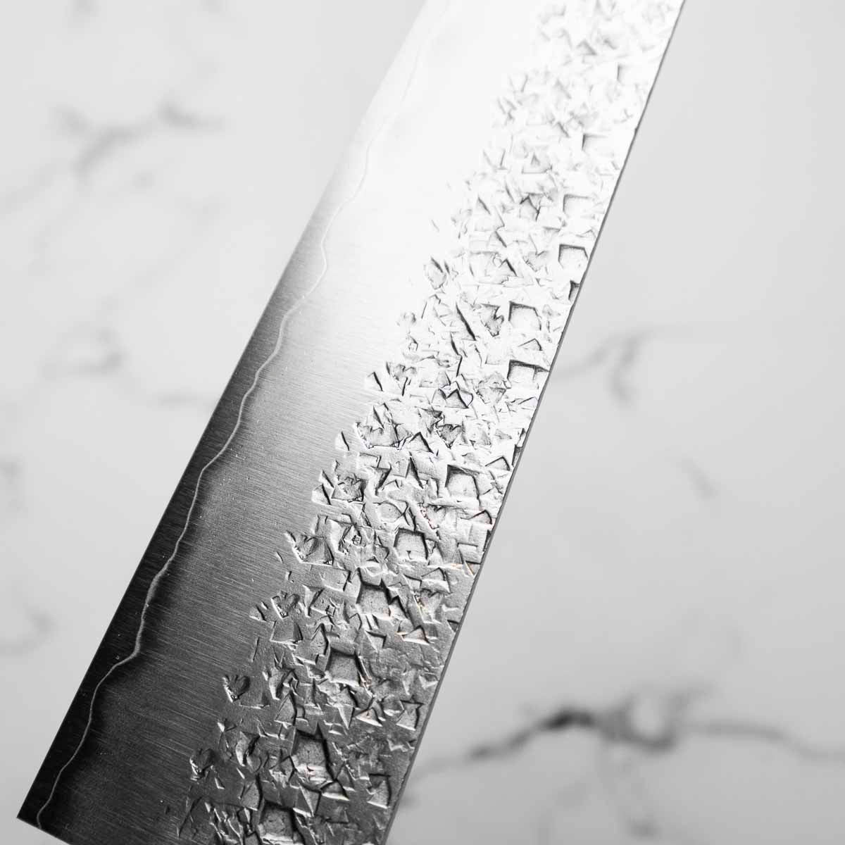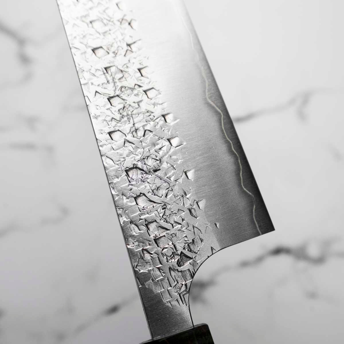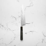 His knives are instantly recognizable for their striking Tsuchime and Suminagashi finishes, thin grinds, and use of high-performance steels such as SG2, HAP40, and stainless-clad Blue Super. Kurosaki’s Fujin series, with its dramatic wind-patterned hammer finish, helped cement his reputation as a blacksmith who blends artistry and technical brilliance in equal measure.