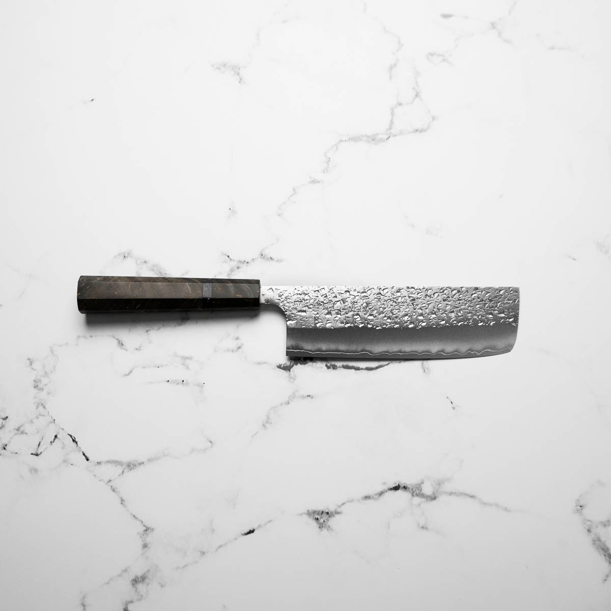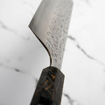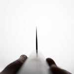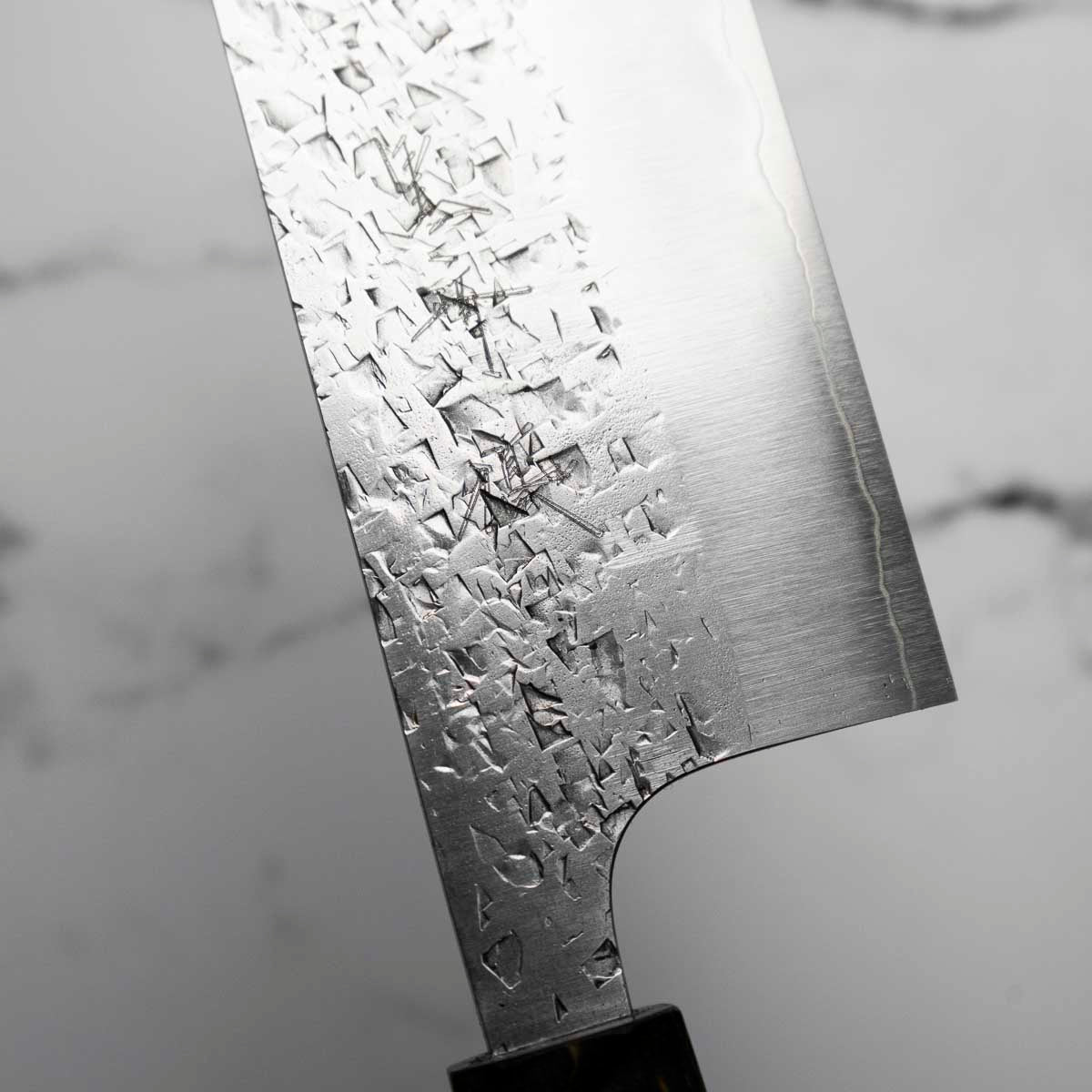 His knives are instantly recognizable for their striking Tsuchime and Suminagashi finishes, thin grinds, and use of high-performance steels such as SG2, HAP40, and stainless-clad Blue Super. Kurosaki’s Fujin series, with its dramatic wind-patterned hammer finish, helped cement his reputation as a blacksmith who blends artistry and technical brilliance in equal measure.