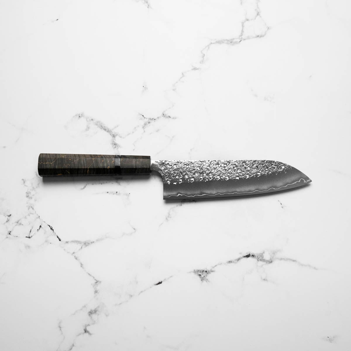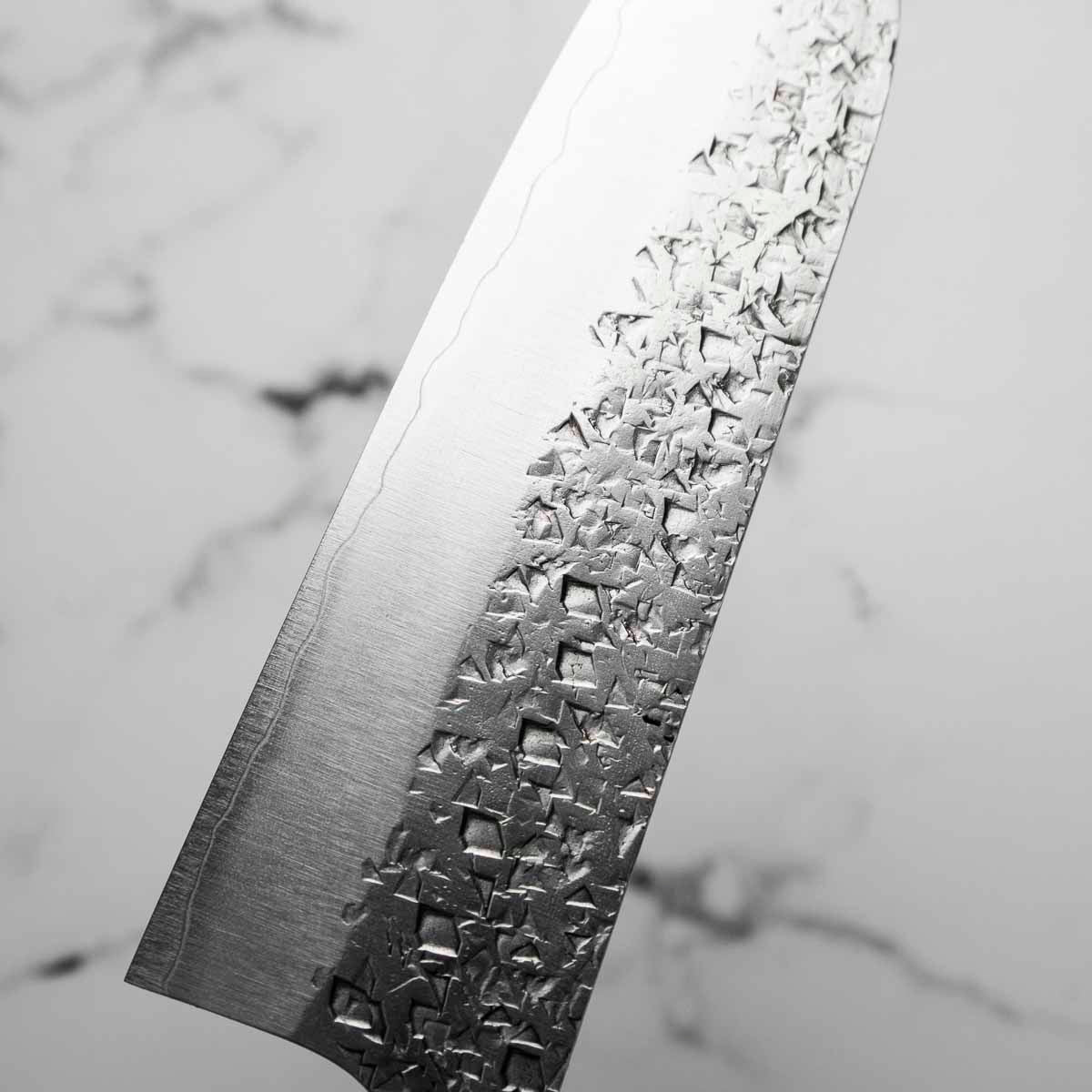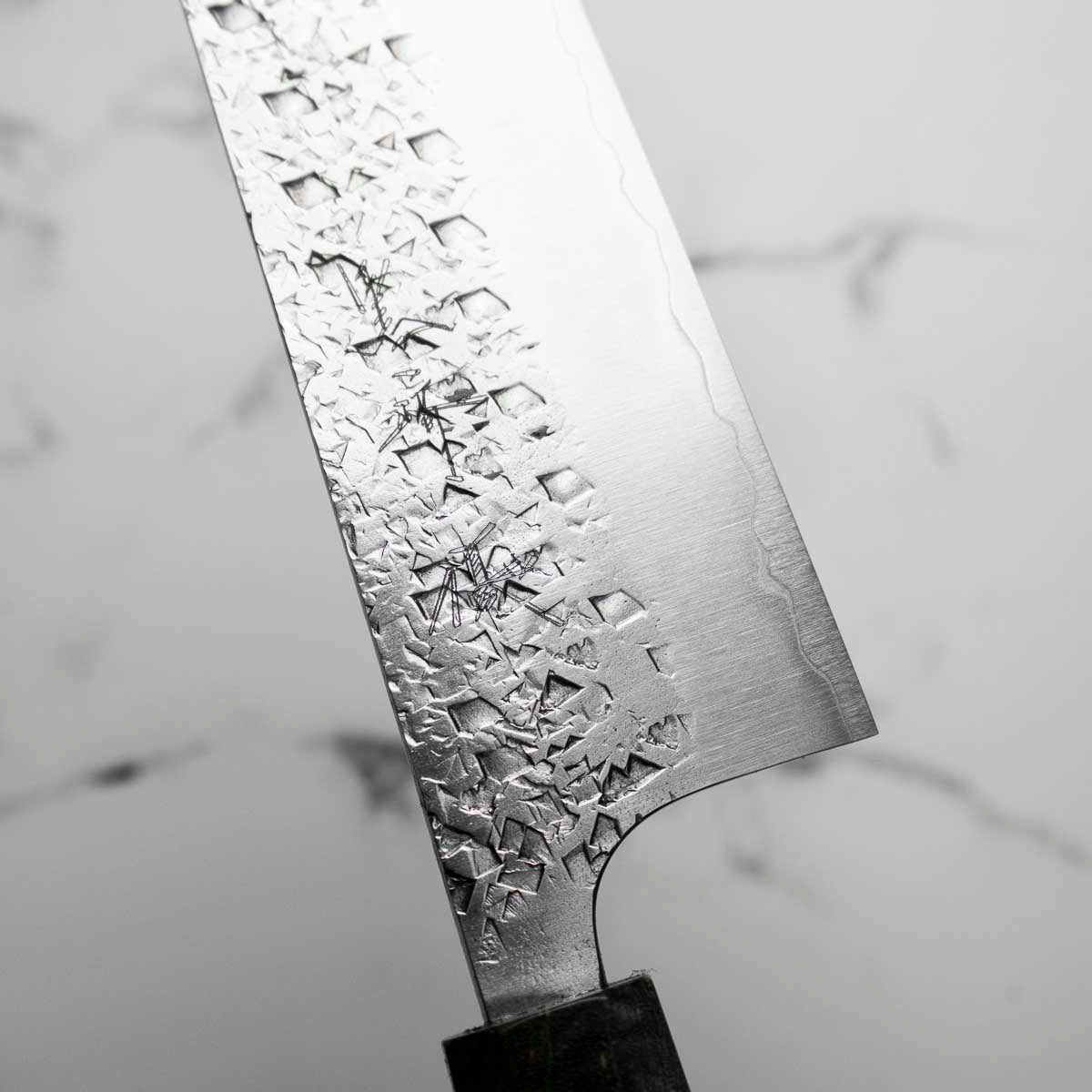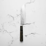 His knives are instantly recognizable for their striking Tsuchime and Suminagashi finishes, thin grinds, and use of high-performance steels such as SG2, HAP40, and stainless-clad Blue Super. Kurosaki’s Fujin series, with its dramatic wind-patterned hammer finish, helped cement his reputation as a blacksmith who blends artistry and technical brilliance in equal measure.