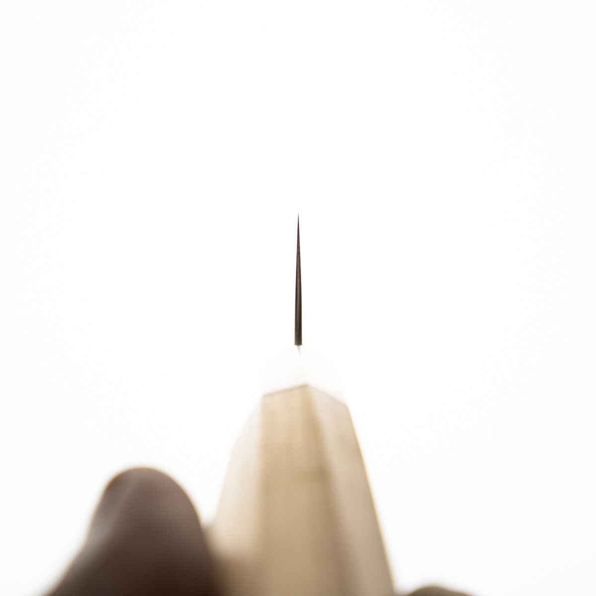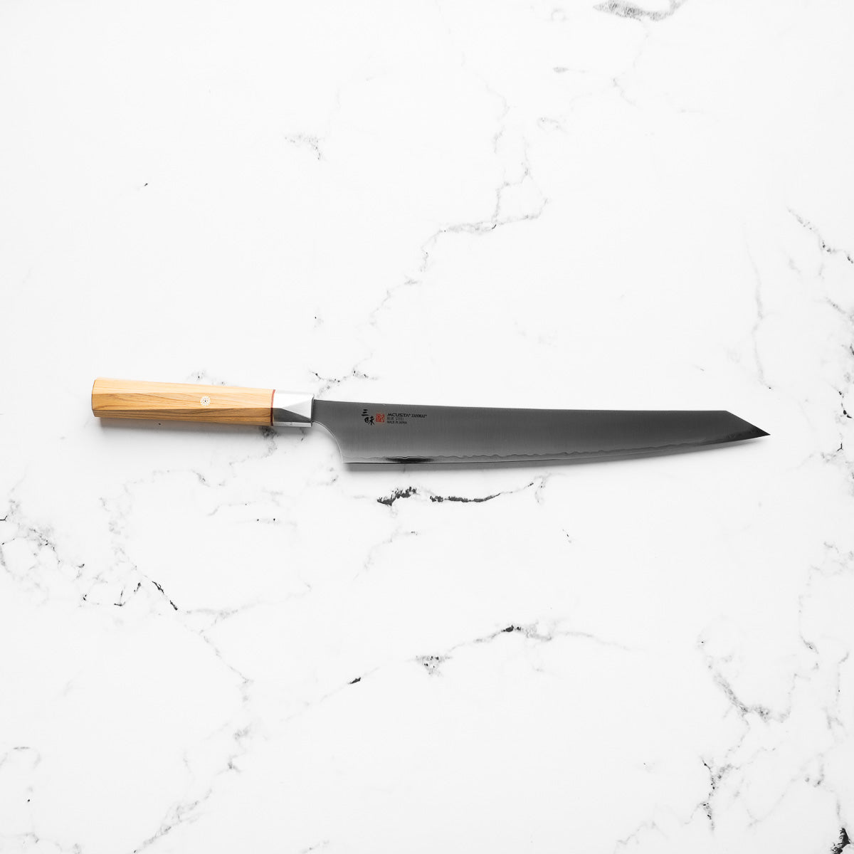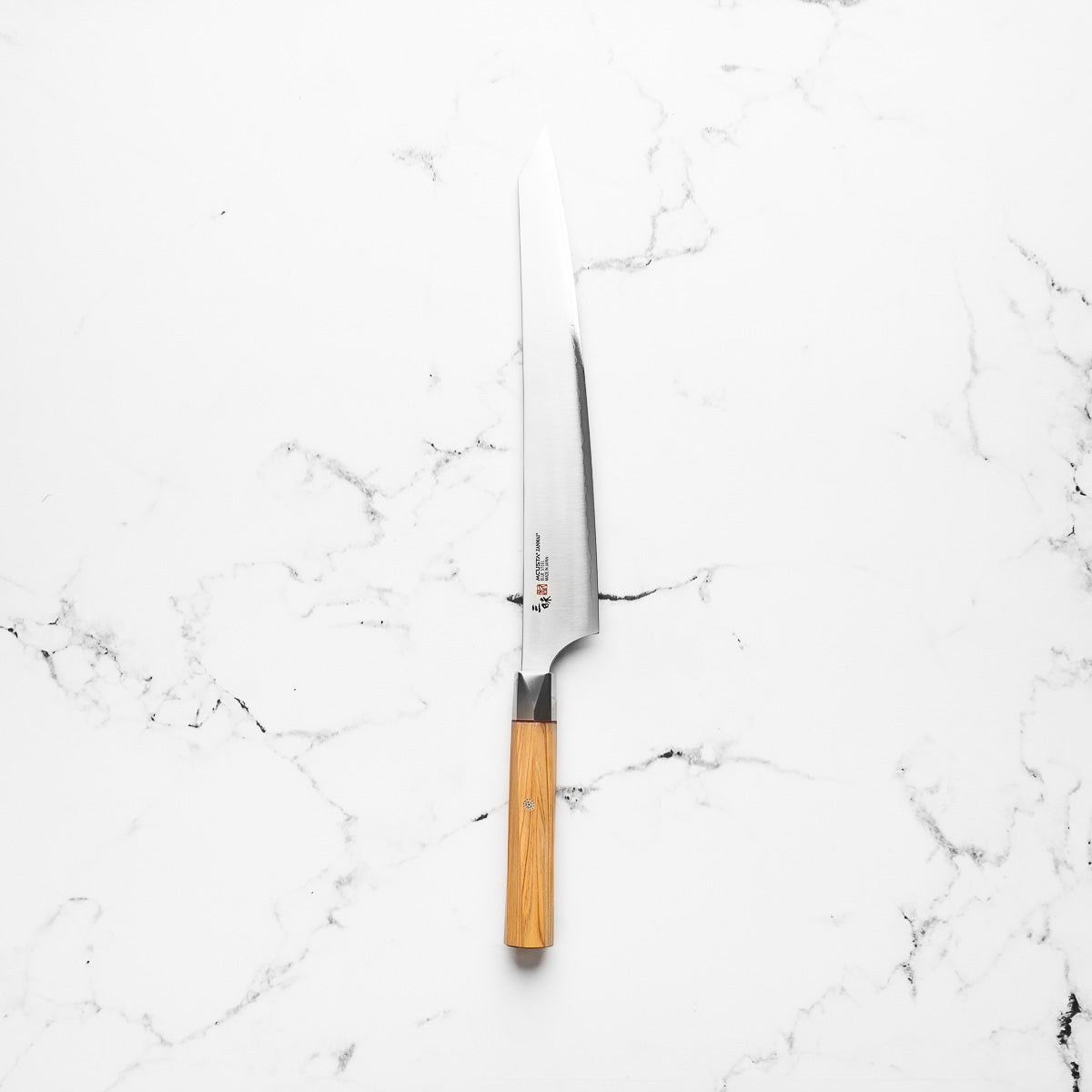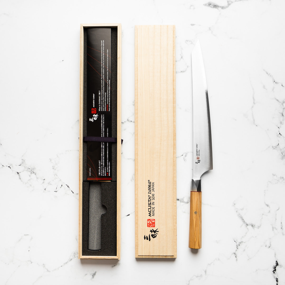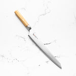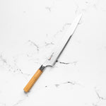 The Sujihiki knife, a traditional Japanese slicer, is designed for carving and fileting. With its long, narrow blade, typically ranging from 240mm to 330mm, it excels in creating clean, smooth cuts through meat and fish. Its length ensures long, uninterrupted strokes, making it perfect for precise slicing tasks.