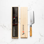 The Bunka knife, a versatile and traditional Japanese kitchen tool, features a distinctive, angular tip and a wide blade. It's designed for precision tasks like slicing, dicing, and chopping. Ideal for handling vegetables, meat, and fish, the Bunka is a multifunctional knife celebrated for its utility and unique aesthetic.